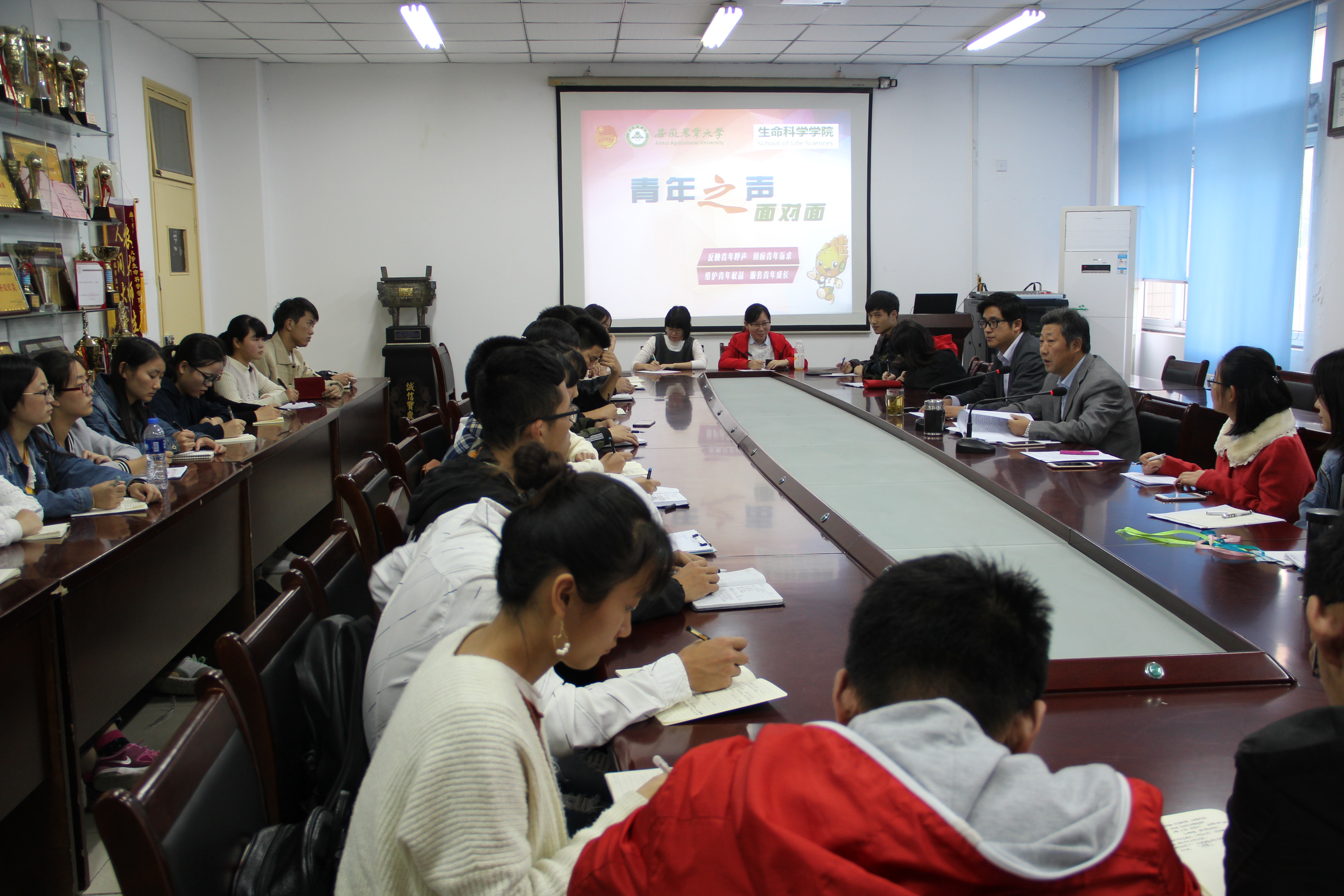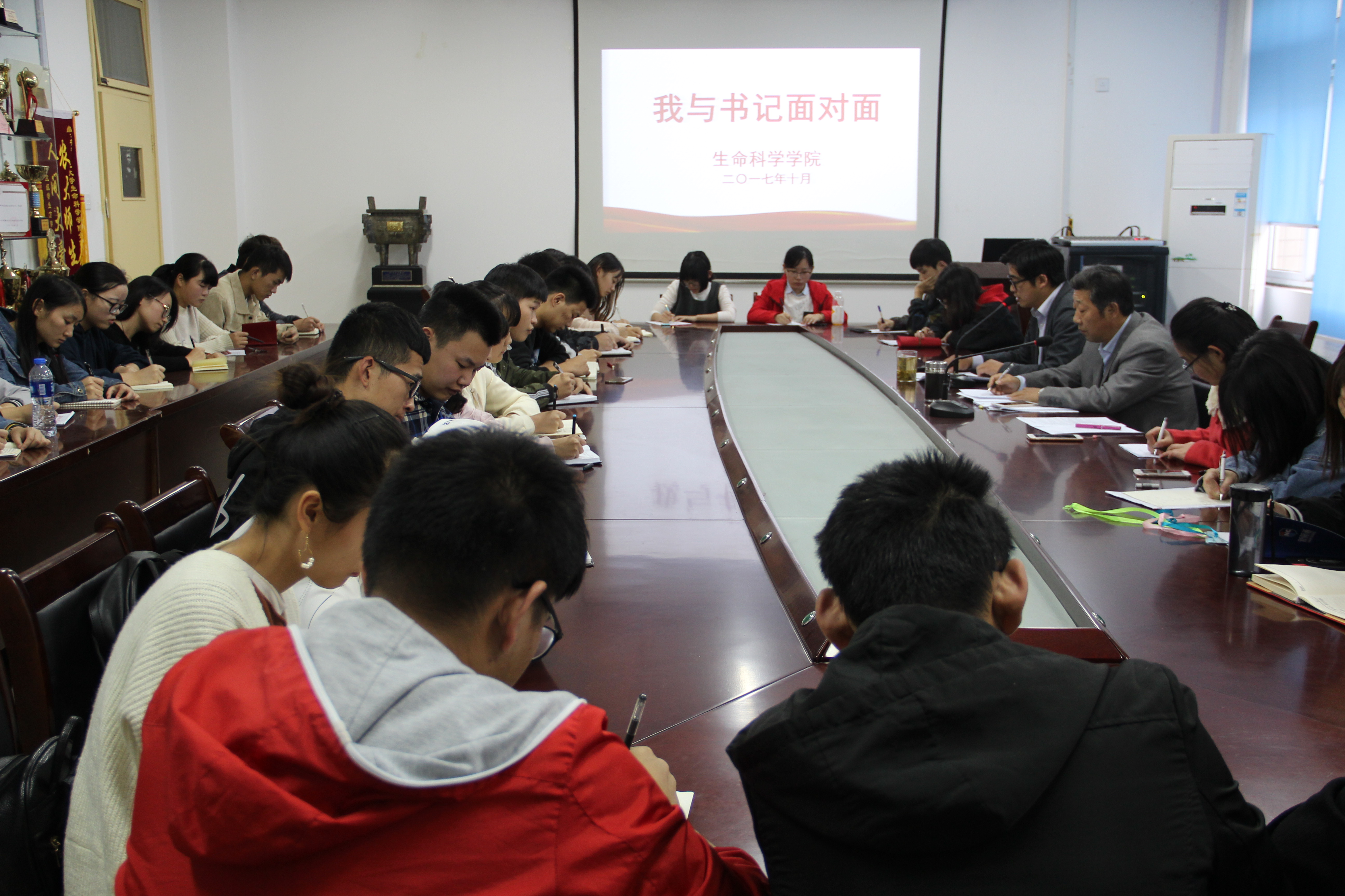 本网讯10月25日下午,生命科学学院在十教216会议室举办“青年之声·我与书记面对面”活动。校党委宣传部部长、学院党委书记朱绍友,学院党委副书记、副院长吴国卿出席了本次活动,院学生分会、团支部及心联委员联合会的主要学生干部参加了活动,活动由院团委老师主持。