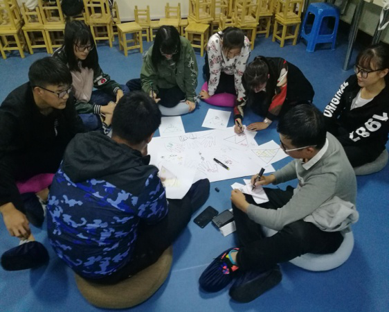 活动分为暖身阶段、相识阶段和总结阶。暖身阶段的活动是“朋友N次方”,增加了挑战性和趣味性,创造了团体的活泼气氛,让同学们彼此增进了解和认识。相识阶段的活动是“团队创作”。活动扩大了同学们的认识范围,将音乐和绘画融入到其中,增进了活动的感染力和吸引力,加强了同学们对集体意识的理解,体验到团队创作的乐趣。