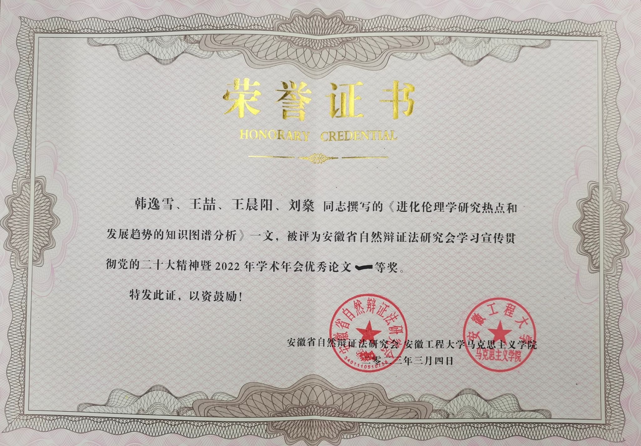 本网讯 3月3日至4日,由安徽省自然辩证法研究会主办、安徽工程大学马克思主义学院承办的“安徽省自然辩证法研究会学习宣传贯彻党的二十大精神暨2022年学术年会”在安徽芜湖举行。来自中国科学技术大学、东南大学、山西大学、南京工业大学、合肥工业大学、安徽大学、安徽农业大学等全国20多所高校300余名师生参会。学院应用心理学专业2020级本科生韩逸雪是唯一一名受邀参会的本科生,并在大会作了口头报告,所提交的学术论文经会议学术委员会评选,荣获优秀论文一等奖。