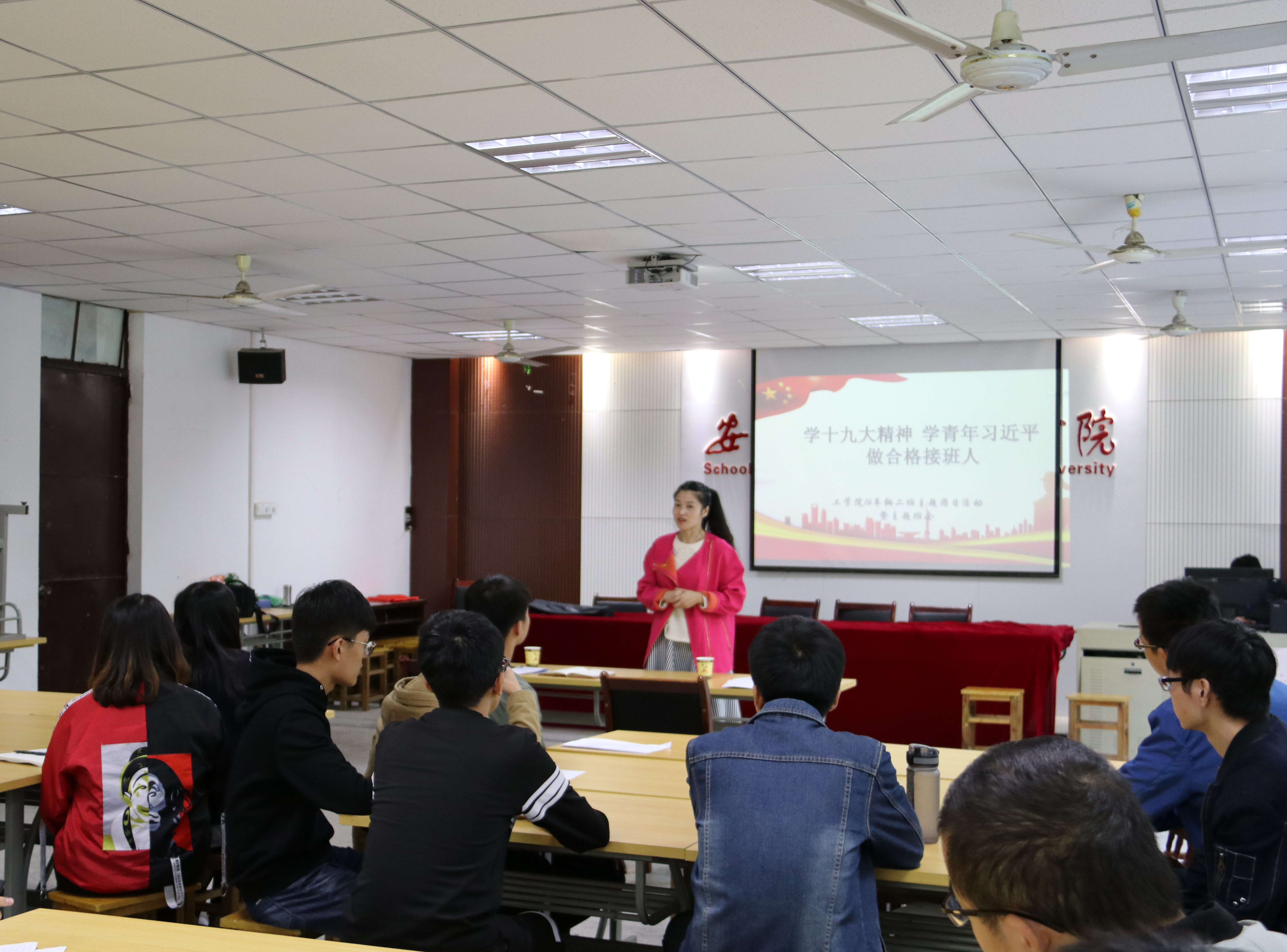 本网讯 10月31日中午,工学院2016级车辆工程2班团支部在三教202举办了“学十九大精神、学青年习近平 做合格接班人”主题团日活动。校团委副书记任琪老师、班主任刘灿老师、2016级车辆工程2班团支部32名团员,通过理论分享、思想碰撞、情景再现、宣誓合唱等多种形式,共同学习了十九大精神、领略了青年习近平的风范,一起经历了一次坚定信仰、不忘初心的精神之旅。