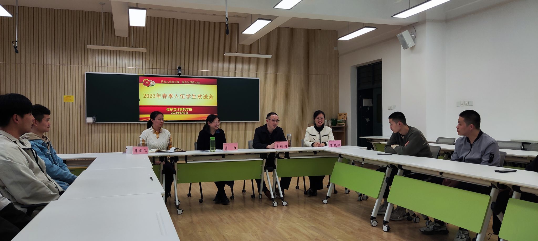 本网讯 3月7日,信息与计算机学院召开2023春季大学生入伍欢送会,学院党委书记葛红、副院长辜丽川、入伍学生辅导员陈晓玲、全体入伍大学生及退伍学生士兵代表参加欢送会。学院党委副书记、纪委书记李南飞主持会议。