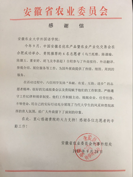 本网讯近日,省农委外事外经处专门给我校外国语学院发来一封《感谢信》,对学院派出学生志愿者参与2017中国安徽名优农产品暨农业产业化交易会服务表示感谢。