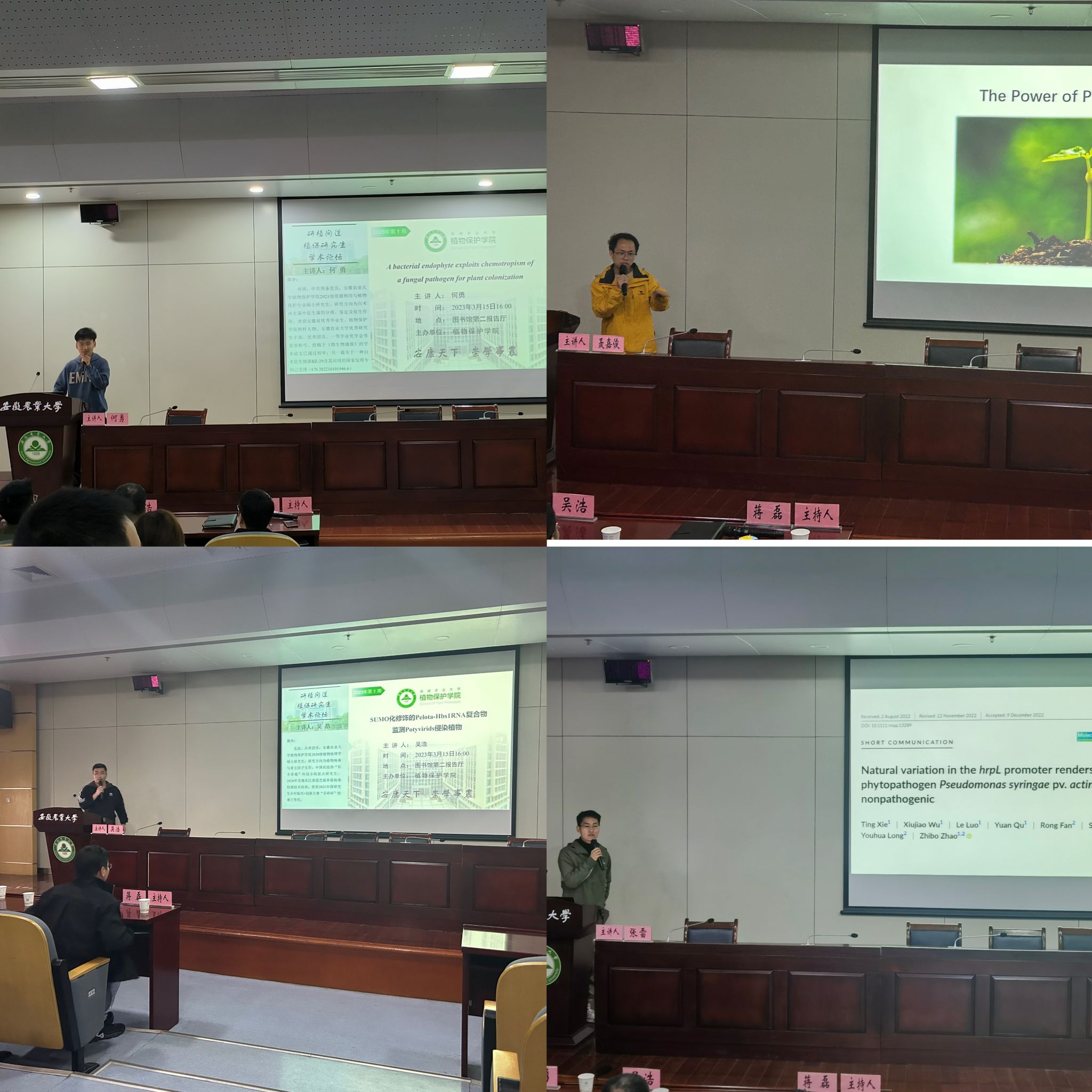 本期学术论坛邀请了学院2022年引进的高层次人才聂嘉俊教授,以及植物病理学系优秀研究生代表张雷、何勇、吴浩三位同学作专题报告。四位主讲人聚焦各自研究领域的学术前沿、科研进展、科研感受等进行了分享。现场报告内容丰富精彩,参会师生讨论热情高涨。在问答环节,在场研究生们积极提出自己的所思所想,抓住与主讲人沟通交流的机会,在解开疑惑的同时提升自身素养。四位主讲人给予了耐心细致答疑,赢得了在场师生的一致好评。