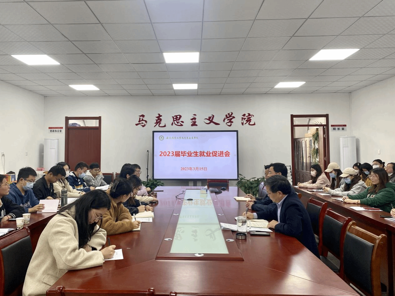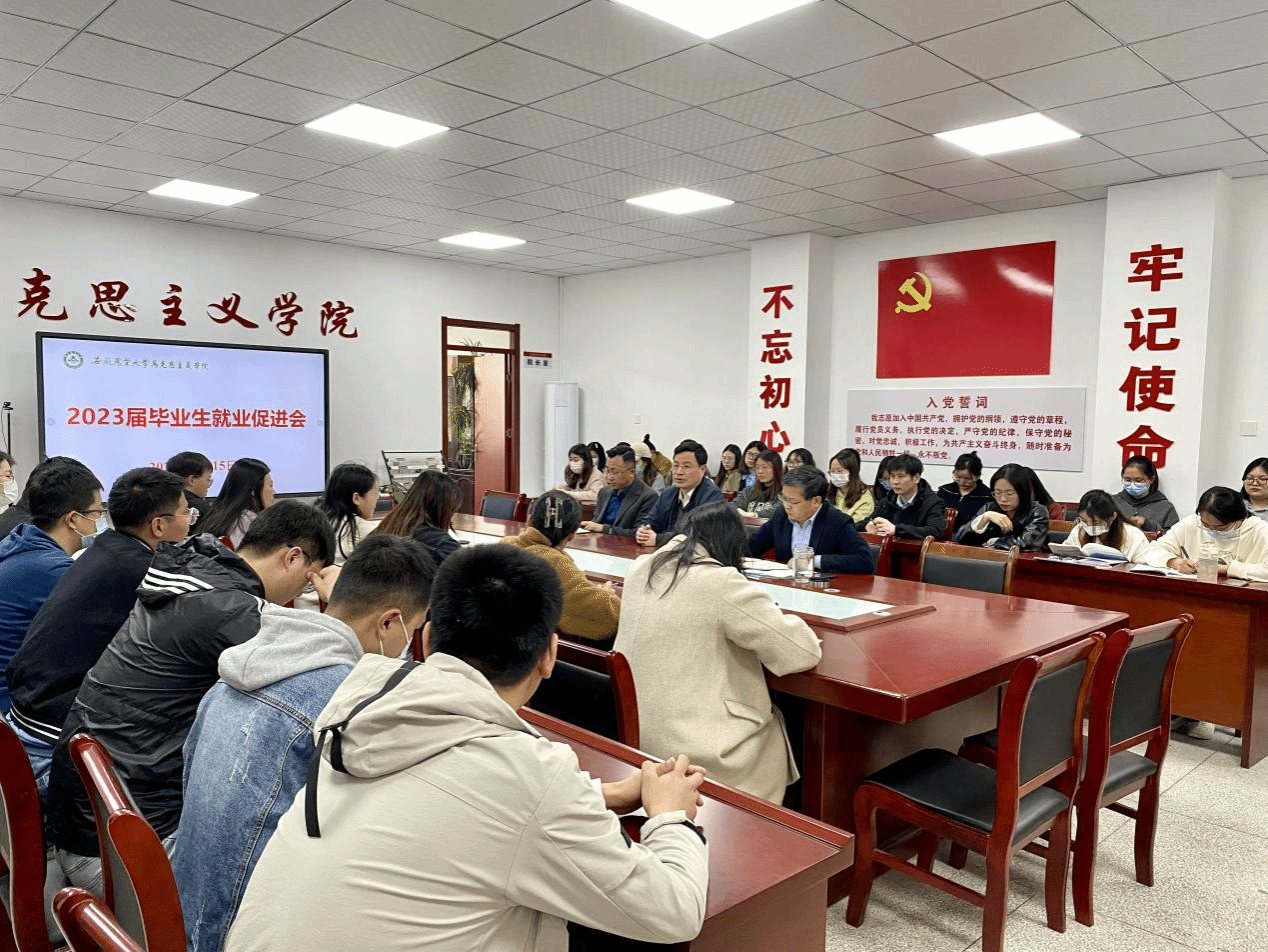 本网讯 为帮助2023届毕业生进一步认清就业形势,分享就业经验与心得,调动就业积极性,3月15日,马克思主义学院召开2023届毕业生就业促进会,学院党委书记孙超,院长方国武,党委副书记、副院长、纪委书记袁修雨,专兼职辅导员及2023届全体毕业生参加本次会议。