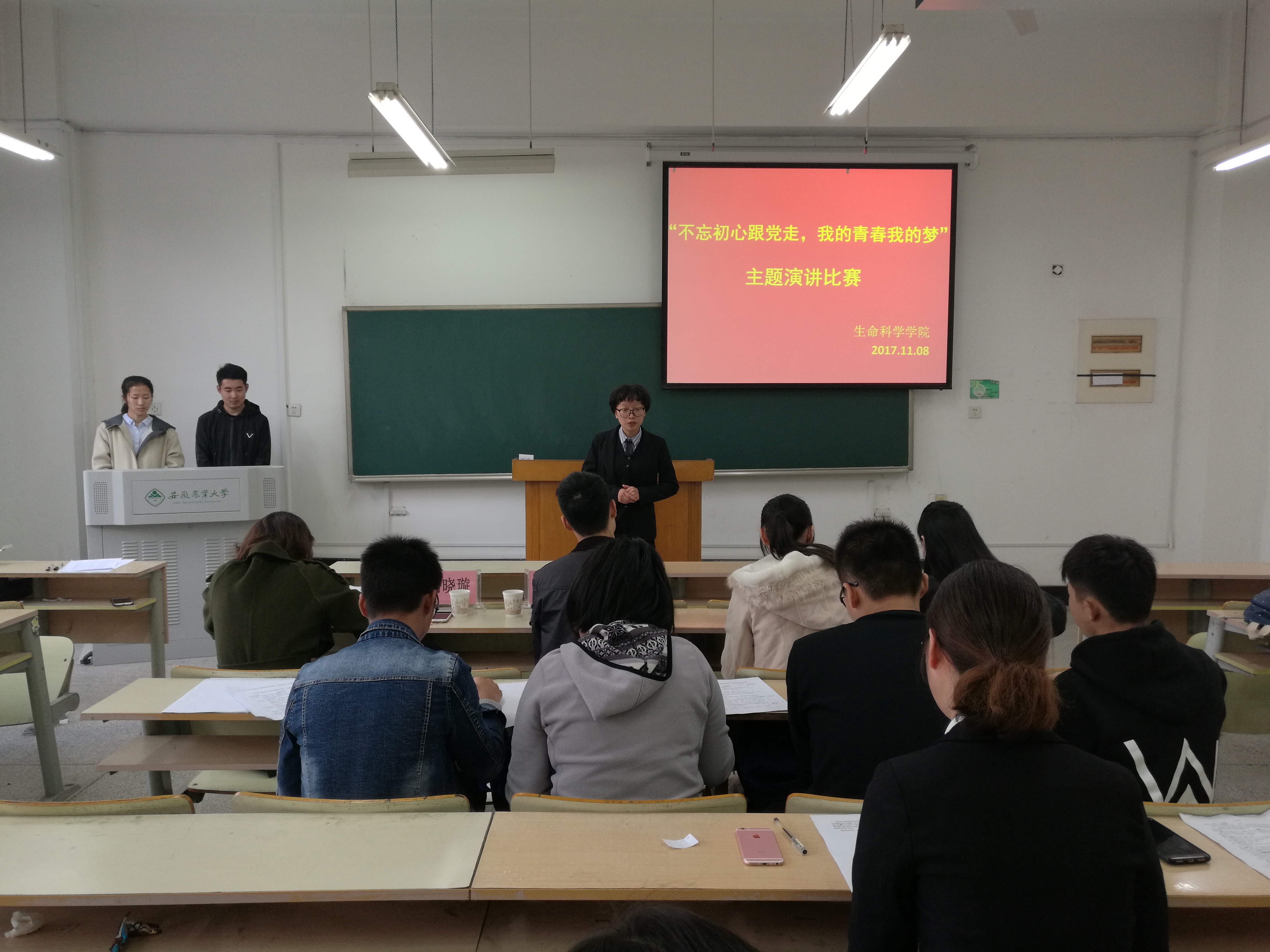 本网讯11月8日中午,生命科学学院在九教116室举办“不忘初心跟党走 我的青春我的梦”主题演讲比赛。学院团委老师、校主持队副队长、往届校演讲比赛获奖选手出席并担任评委。