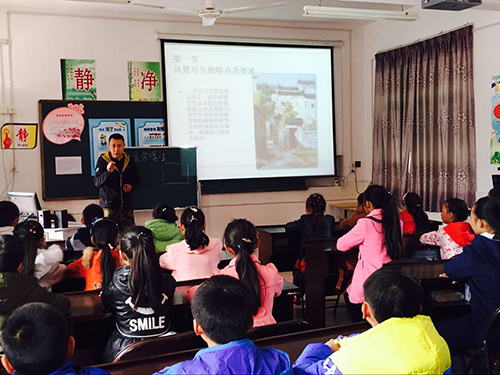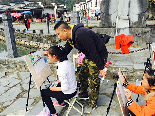 陆小彪副教授为孩子们进行了理论及实践两场教学。在西递中心小学,陆小彪用浅显易懂的语言告诉孩子们色彩的三原色、如何选景、如何用手中的笔去叙述看到的实物以及构图等等,风趣幽默的言语让课堂氛围分外活跃,带领孩子们在艺术的世界里体验、感悟;在西递景区,陆小彪手把手地教孩子们调色、选景等。在陆小彪的指导下,孩子们切实感受到了写生艺术的魅力,心中种下了一粒艺术梦想的种子。