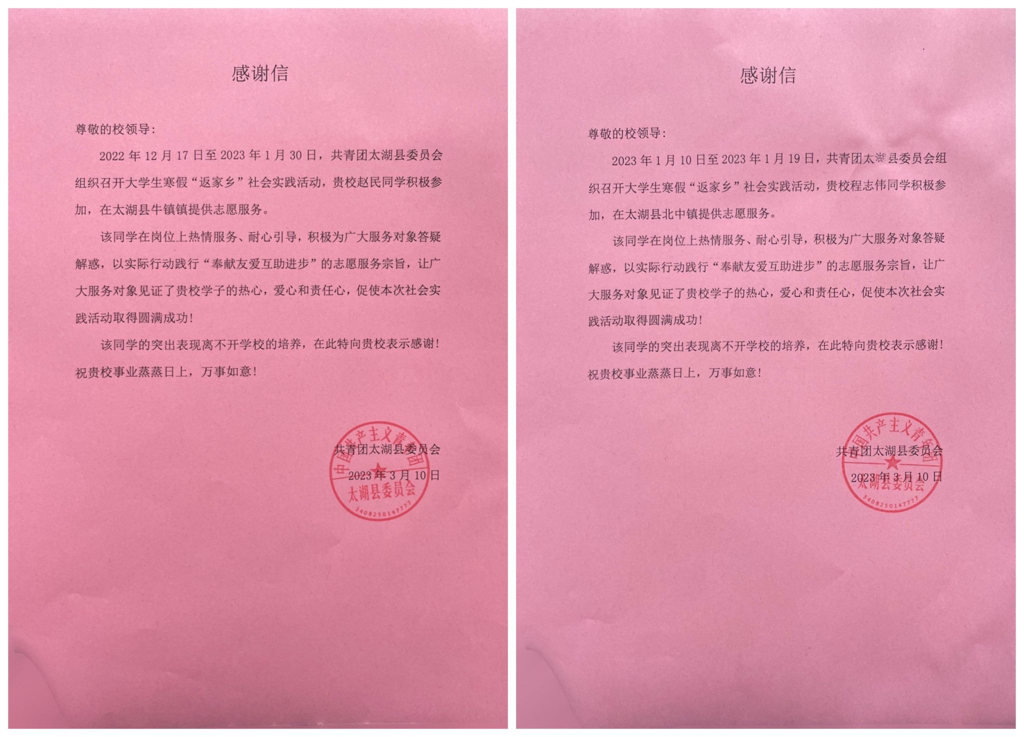 本网讯 志愿服务暖人心,实践育人强担当。近日,校团委收到了来自共青团太湖县委的感谢信。信中,共青团太湖县委对我校经济管理学院程志伟同学、资源与环境学院赵民同学在参加2023年大学生寒假“返家乡”社会实践活动中的优异表现表示了肯定与赞扬,对我校的支持表达了感谢。