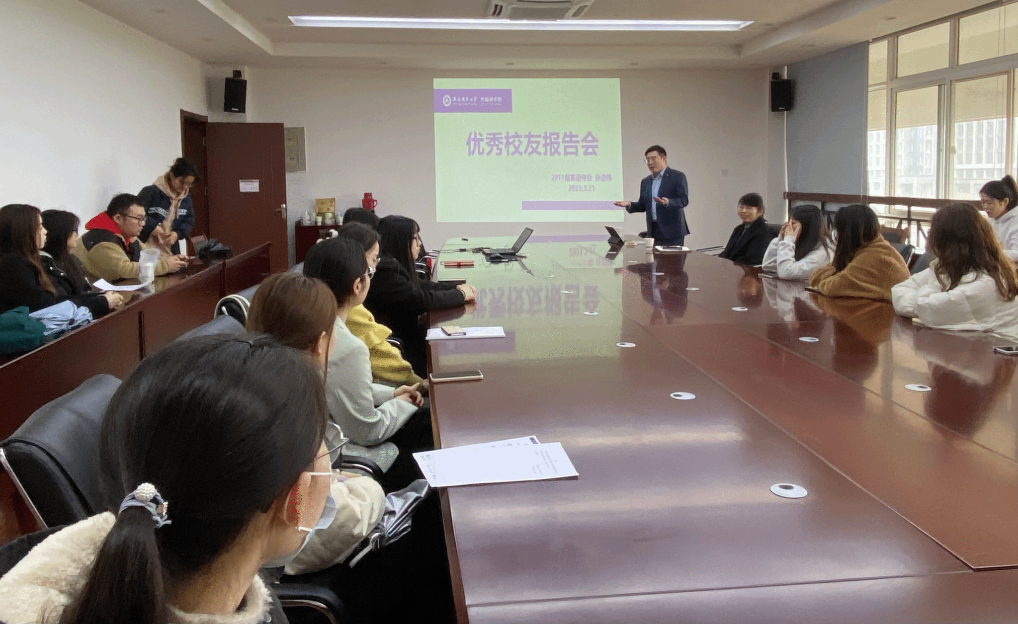本网讯 3月23日下午,外国语学院在外语楼506会议室举办优秀校友报告会暨校友企业专场宣讲会,尼尔钢铁贸易有限公司人事财务部副总经理刘丹、国际业务部副总经理孙浩伟校友、外国语学院党委副书记姬惠惠、2023届部分毕业生等参加了会议。