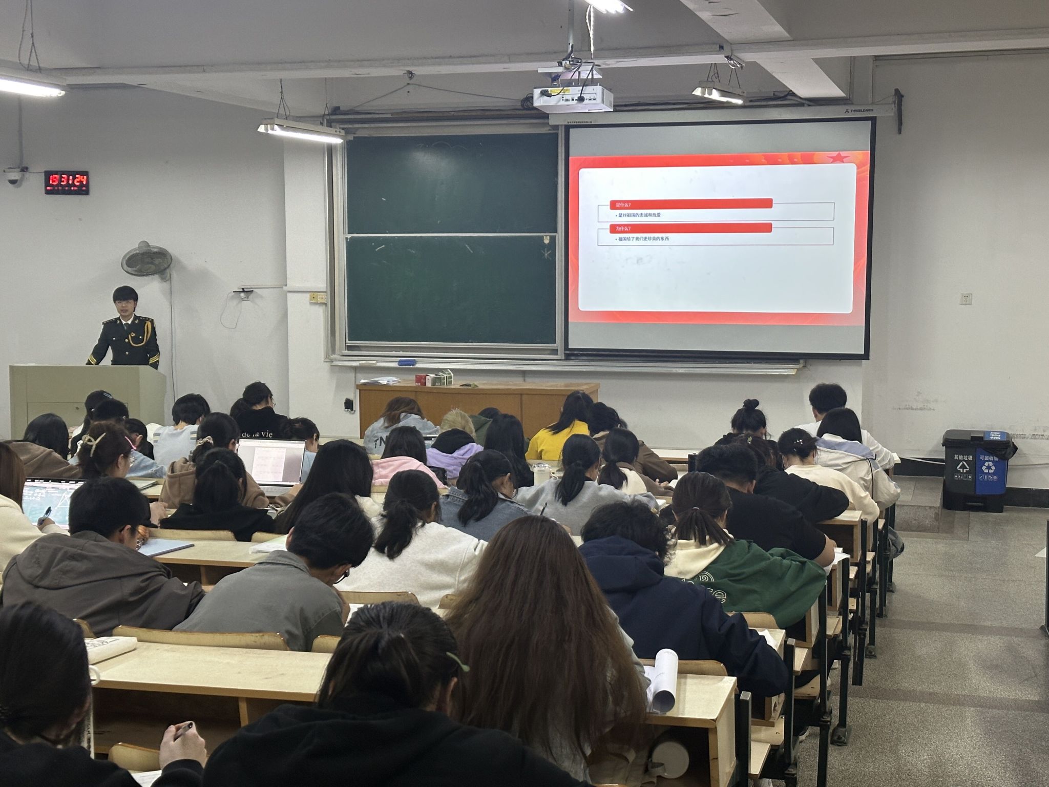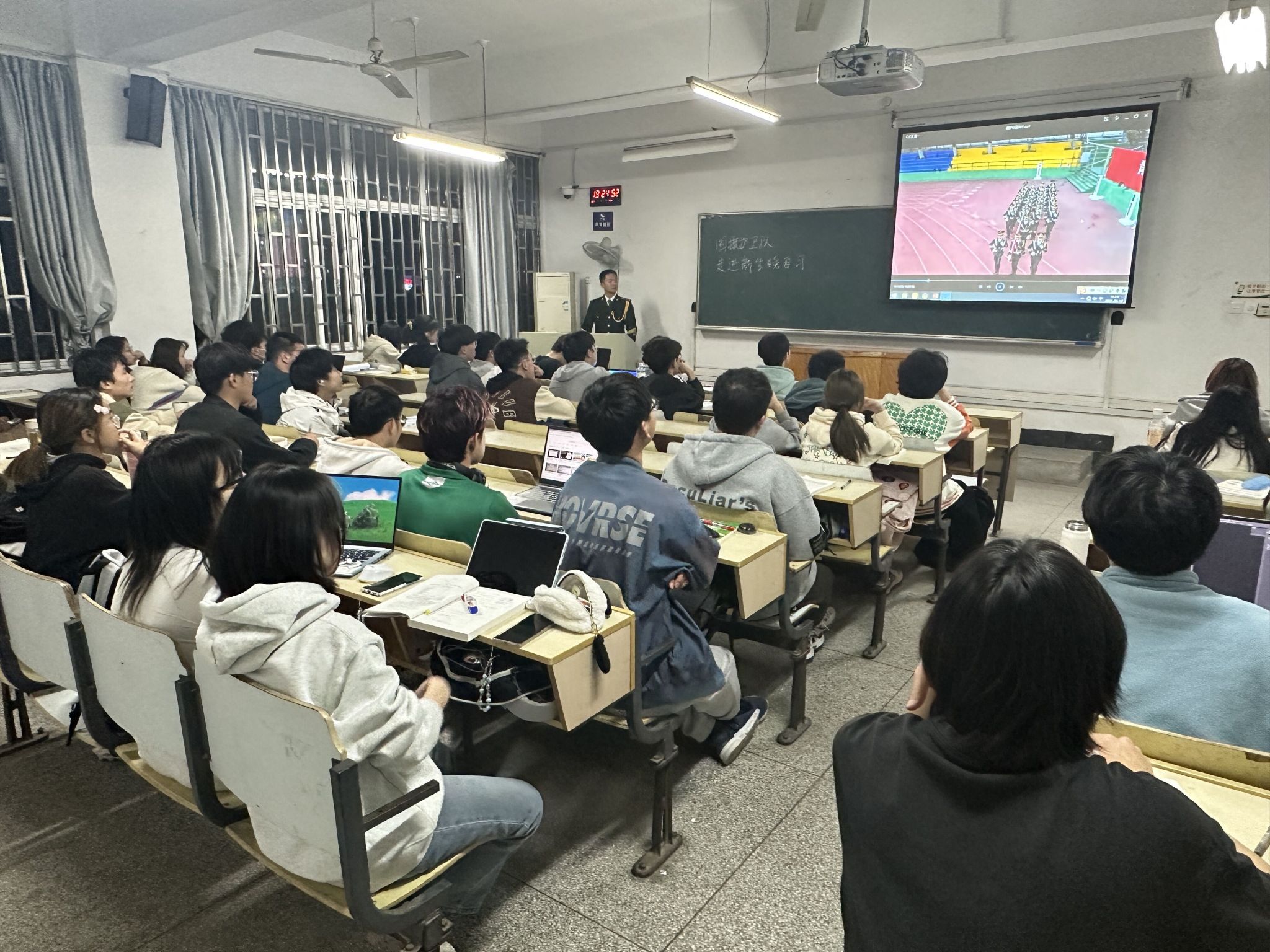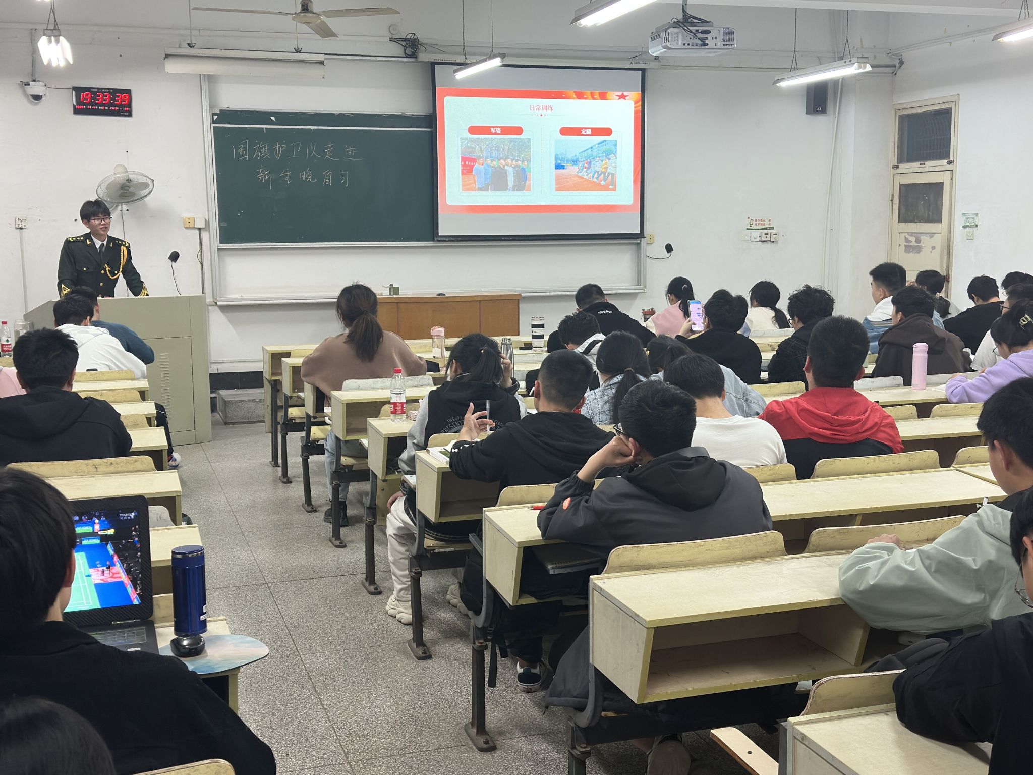3月6日-3月23日期间,每周一晚19点,经过精心准备,魏郑、柏哲、王文飞3位同学身着国旗护卫队制服深入学院14个新生班级解读国旗法、普及国防安全知识、介绍最新国家形象网宣片《PRC》和《安农大国护最新宣传片》、讲述校园国护生活、宣传应征入伍政策,宣讲爱国主义精神,持续激扬主旋律,传播青春正能量,在场学生反响热烈。