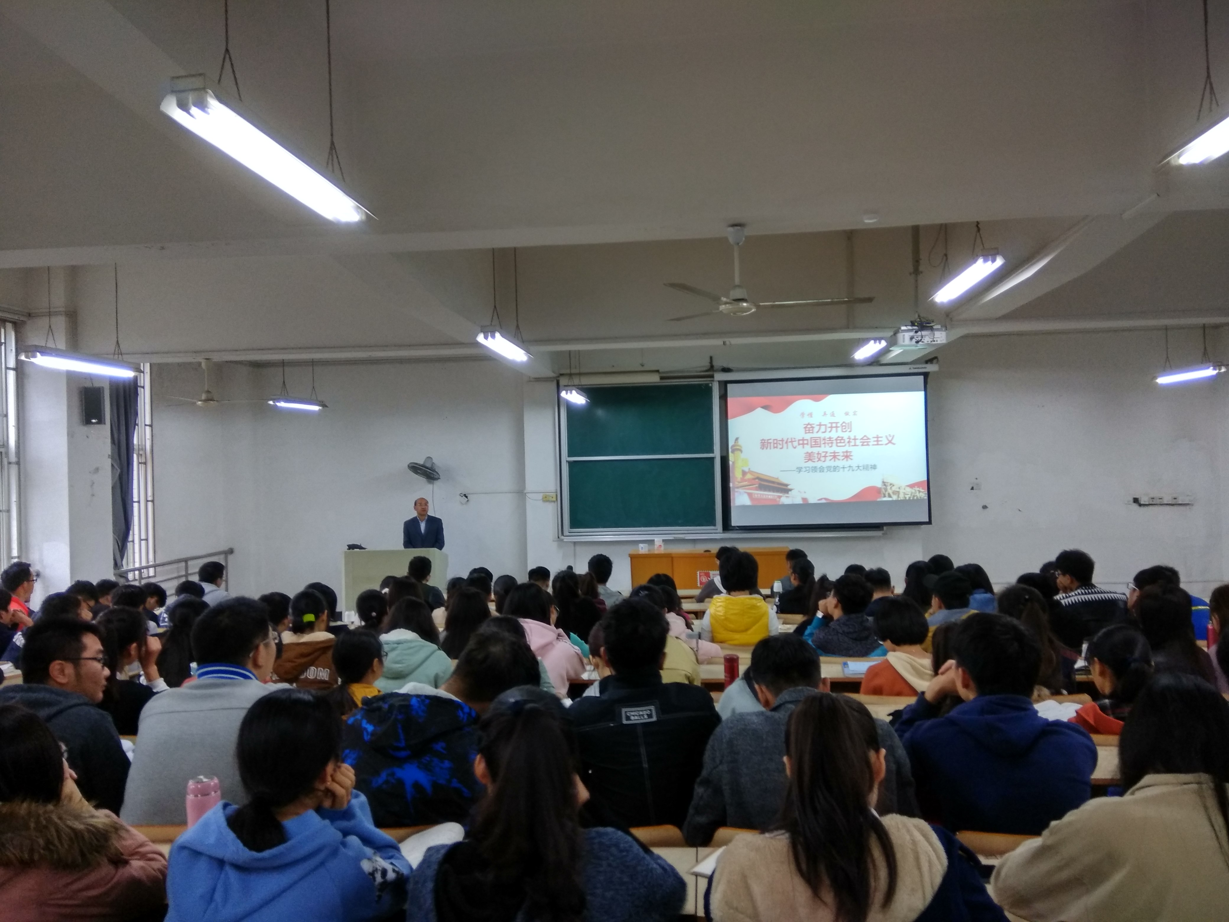 方从兵教授重点剖析十九大报告的主要内容。结合时政热点,图文并茂地为同学们系统梳理了十九大报告的要点,全方位、系统化、多角度地阐述理论和思想指导,帮助同学们加深对党的十九大精神的理解和认识。他指出党的十九大是一次具有划时代、里程碑意义的重要会议。十九大报告中体现了一系列的新思想、新观点、新论断、新要求,令人耳目一新、豁然开朗,有非常强的思想震撼力、感召力。