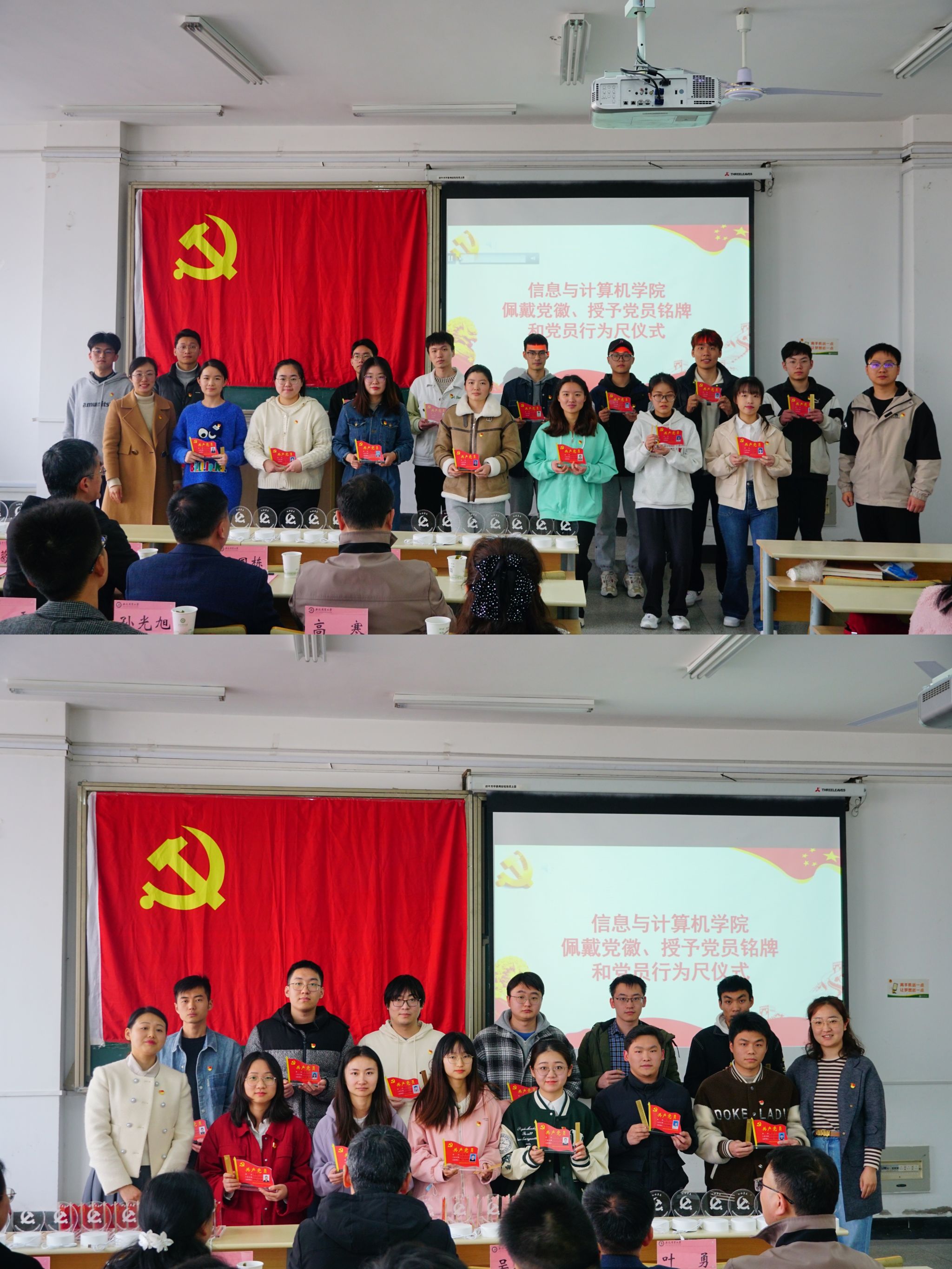 入党是政治生命的开始。仪式上,学院党委委员、副院长张武郑重宣读新发展党员名单及按期转正党员名单。毕业生党员逐一为新发展党员佩戴党徽,金灿灿的党徽亮出的是责任,赢得的是信任,接受的是监督,时刻提醒党员要始终牢记党的宗旨,增强党员的责任感、使命感和荣誉感。仪式上,还为预备党员发放了“党员铭牌”和“信计行为尺”,为按期转正的党员点亮了“信计初心灯”。“党员铭牌”时刻提醒广大党员铭记第一身份,牢记神圣职责,践行履职承诺,发挥模范作用。“信计党员行为尺”告诫党员要做到心中有尺、行事有度,牢固树立党章党规党纪意识,做到守纪律、讲规矩,知敬畏、存戒惧,自觉在廉洁自律上追求高标准,在严守党纪上远离违纪红线。“信计党员初心灯”旨在唤醒党员初心,强化党员政治认同,坚定党员理想信念,提高党性修养,督促党员时刻铭记初心和使命,用实践强化行动,用行动践行诺言,以钉钉子的精神将学习、工作、生活等任务落实。