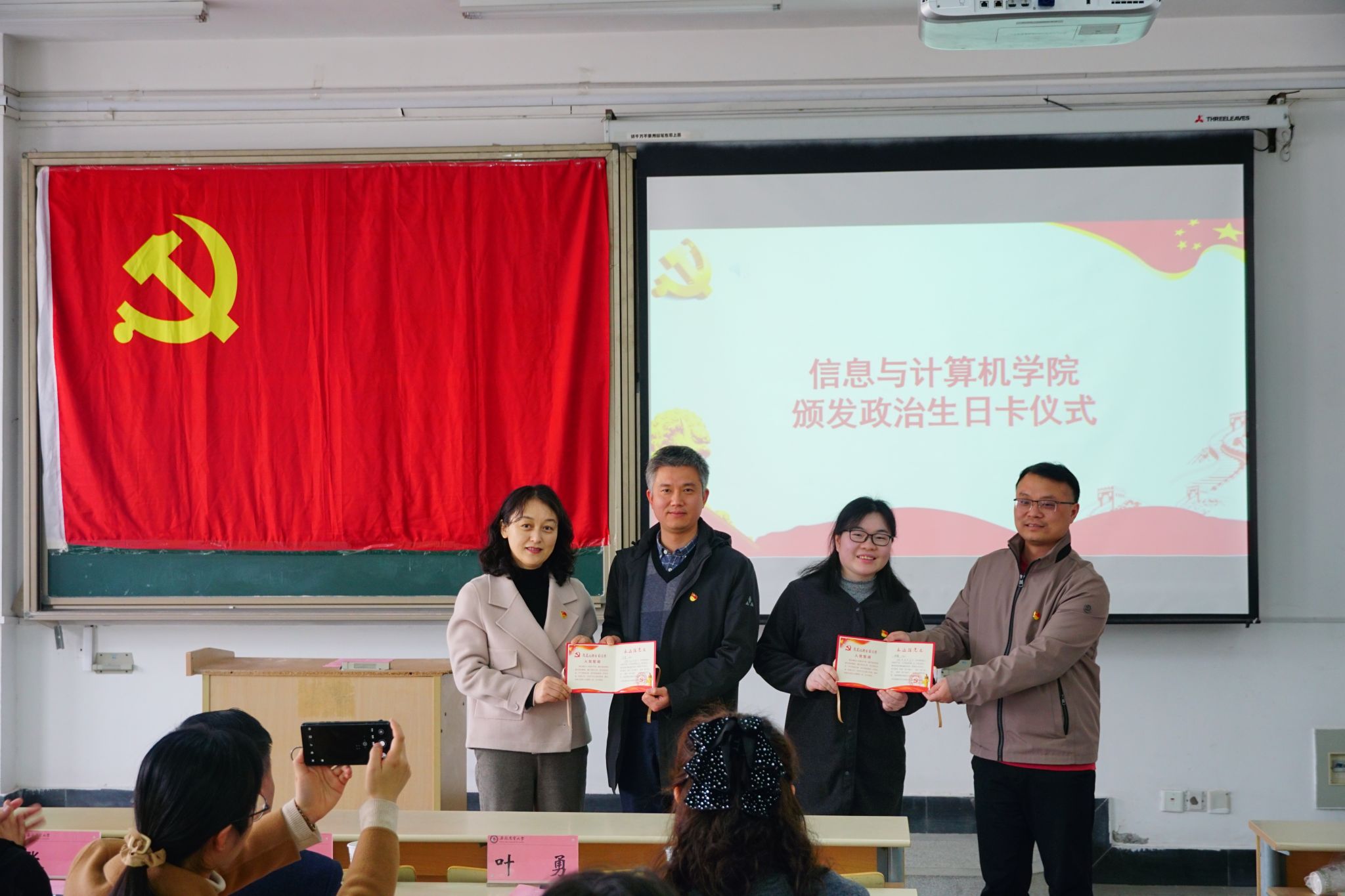“政治生日”是每位共产党员入党的日子,也是每位党员政治生命中最重要的一天。计算机系教工第二党支部王逢秋、计算机系教工第一党支部党员闫勇、计算机基础教学部教工党支部许高建、物流工程系教工党支部党员杨露,分别迎来了入党40周年、25周年和20周年纪念日,教工支部书记吴云志和叶勇为闫勇和杨露老师现场颁发政治生日卡并送上生日祝福,全体党员用掌声为他们庆祝政治生日。物流工程系教工党支部党员杨露结合自己在农大学习、工作、生活23年的所见所感,追忆入党初心,砥砺赤诚忠心,她强调“将用自己的实际行动,用自己的所学所长,一路认真,一路执着,一路坚守,坚守师者初心,牢记育人使命,诠释责任担当。”许高建深信“教师是一份光荣而神圣的职业,要努力做到德才兼备,以德树人;要坚持不忘初心,上好每一堂课,站好三尺讲台;要不断学习,自我革新,把最新的知识传授给学生。”闫勇感慨道“我将自己在荣事达生产设计第一线工作多年积累的工程开发实践经验传授给学生,希望能够将计算机专业的硬件实践教学做得更好,让更多的学生在走出校门前对工程实践建立更为具体的认识。”