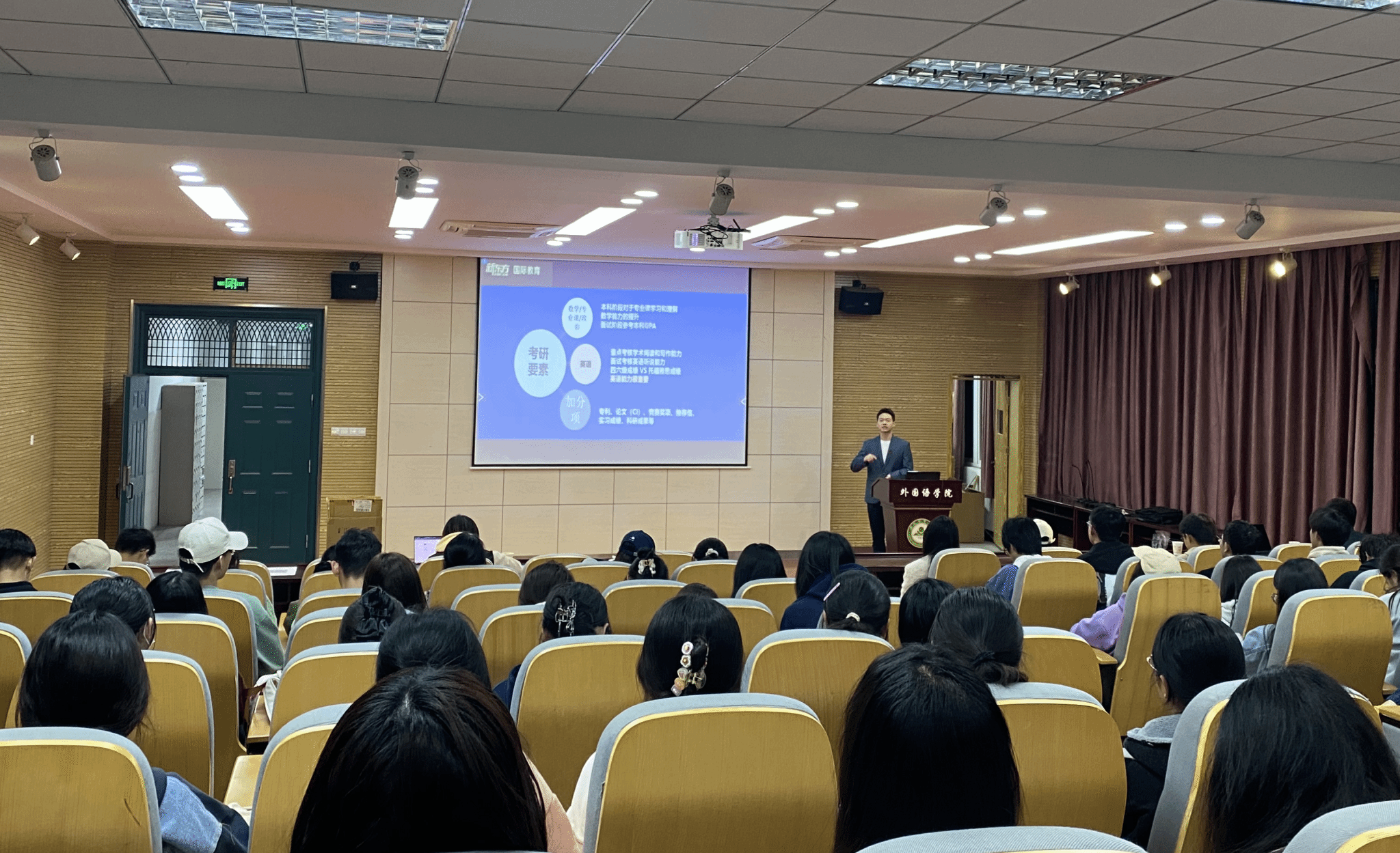 本网讯 为帮助学生明确职业生涯规划的重要意义,科学规划大学四年的学习生活,3月28日晚上,外国语学院特别邀请了合肥新东方国际教育培训中心耿艳亮老师在外语楼502报告厅开展了一场大学生职业生涯规划讲座。学院2022级全体学生聆听了讲座。