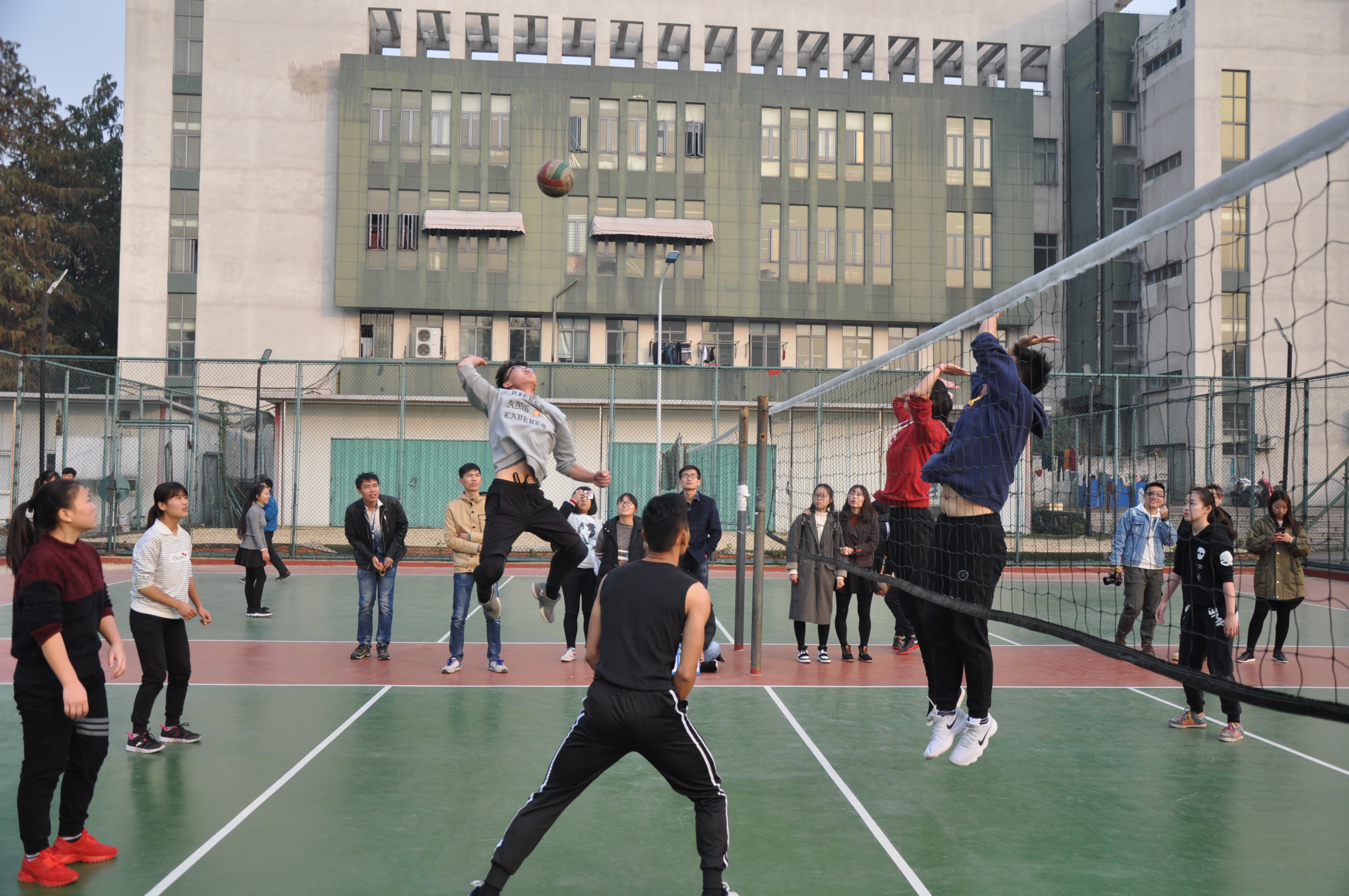 比赛尚未开始,场地内已经聚满了观看比赛的同学们,队员们也都信心满满,一个个斗志昂扬,誓争第一。赛场上大家默契配合,男生们一个个漂亮的扣球,一次次有力的发球;姑娘们也不示弱,她们各施绝技,身姿灵巧,配合密切,敢打敢拼,巾帼不让须眉。头,肘,手,脚,运动员们用尽身体各个部位进行了一个又一个精彩的传球和进攻,场外观众们的欢呼声也是此起彼伏。
