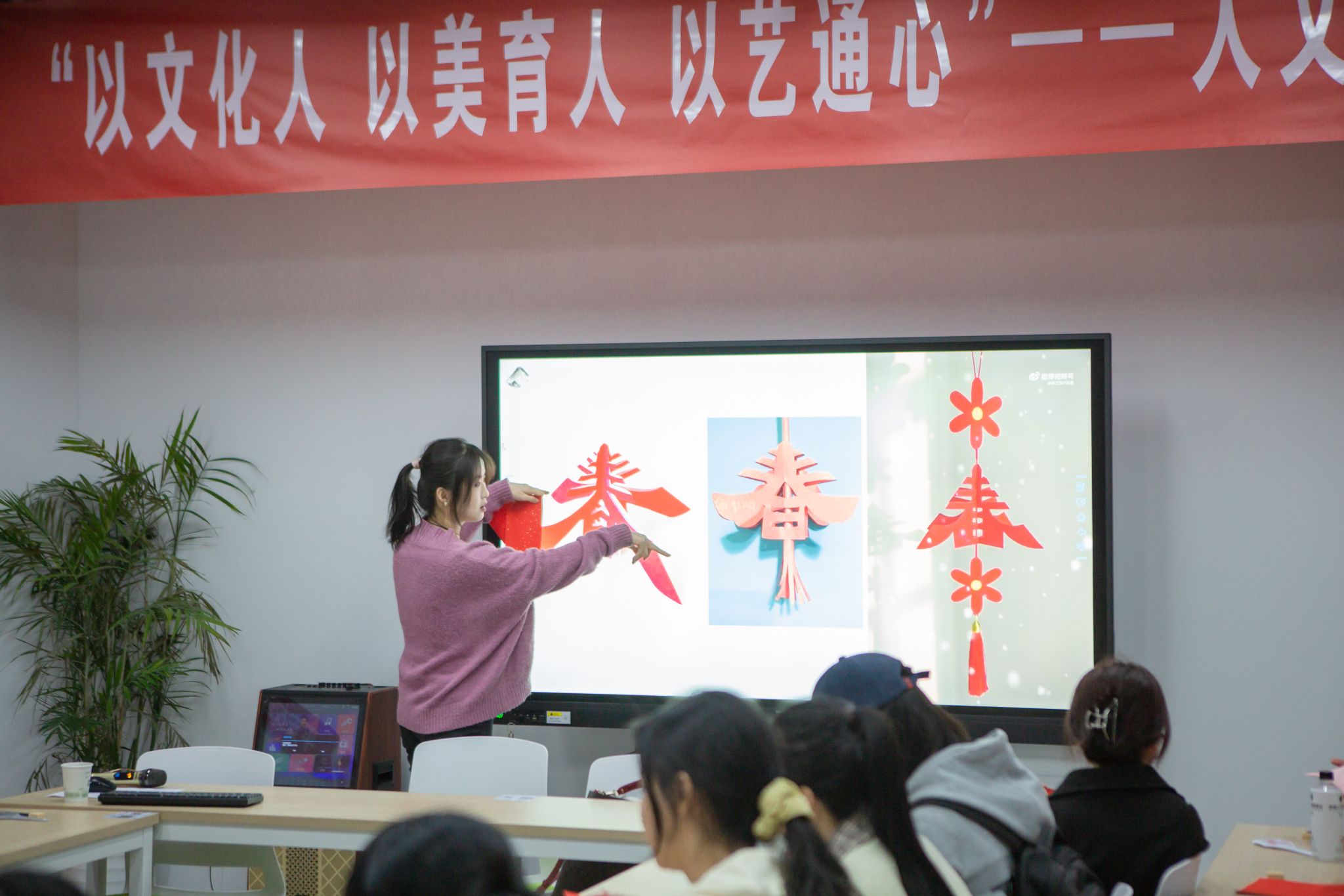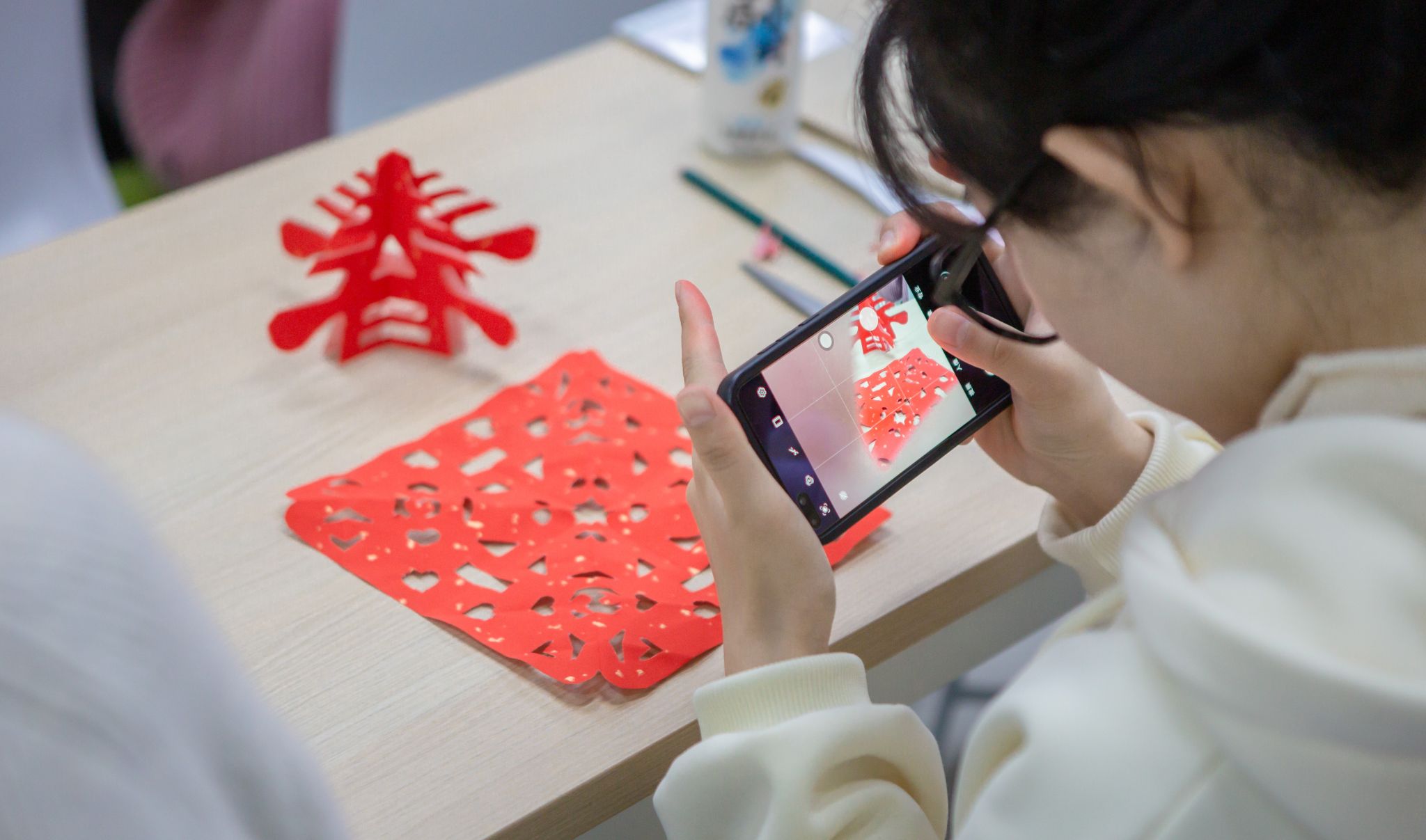 活动伊始,张涵老师向学生们讲解了民俗类非物质文化遗产——剪纸的起源和历史沿革,并对剪纸艺术的美学价值、艺术特征与发展现状进行了讲述,让学生对这门古老民俗艺术增添了一份感性的认识;她还在现场展示了窗花的剪纸技艺与精美的剪纸作品,让学生了解剪纸艺术的创作过程;在她的指导下,学生们拿起剪刀,开始自主创作剪纸作品,一张张普通的红纸经过同学们的精心剪裁,呈现出各式各样的精巧图样。通过剪纸艺术创作,学生们在这个过程中进一步了解剪纸和剪纸背后的传统民俗文化的魅力。