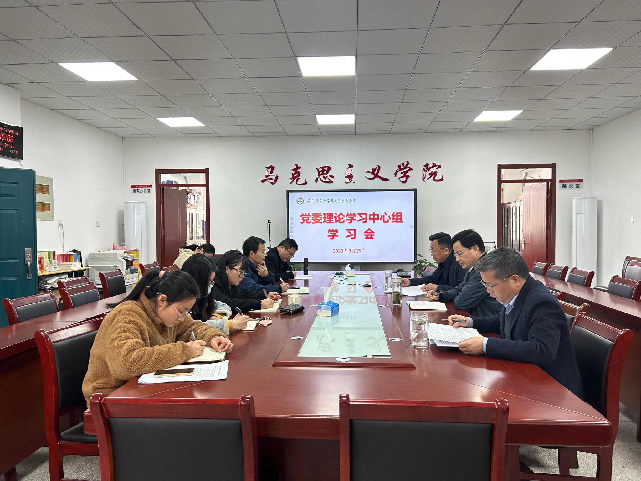 本网讯 3月29日下午,马克思主义学院在人文楼302室召开党委理论学习中心组学习会,开展理论学习研讨,会议由院党委书记孙超主持。院党委副书记、院长方国武,院党委副书记、纪委书记、副院长袁修雨以及院党委委员、各党支部书记等参加了会议。