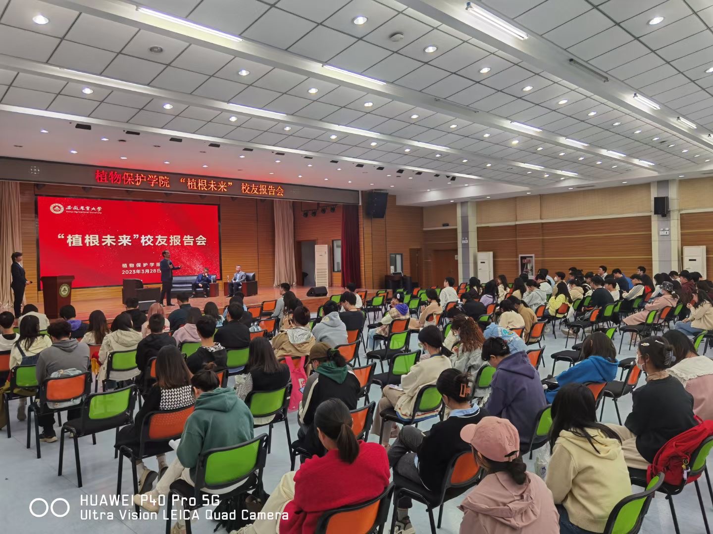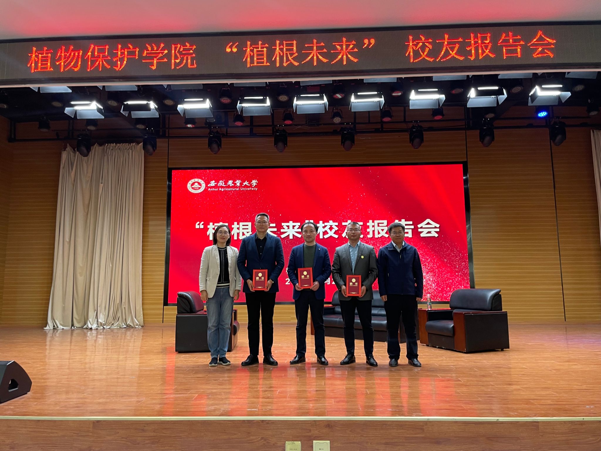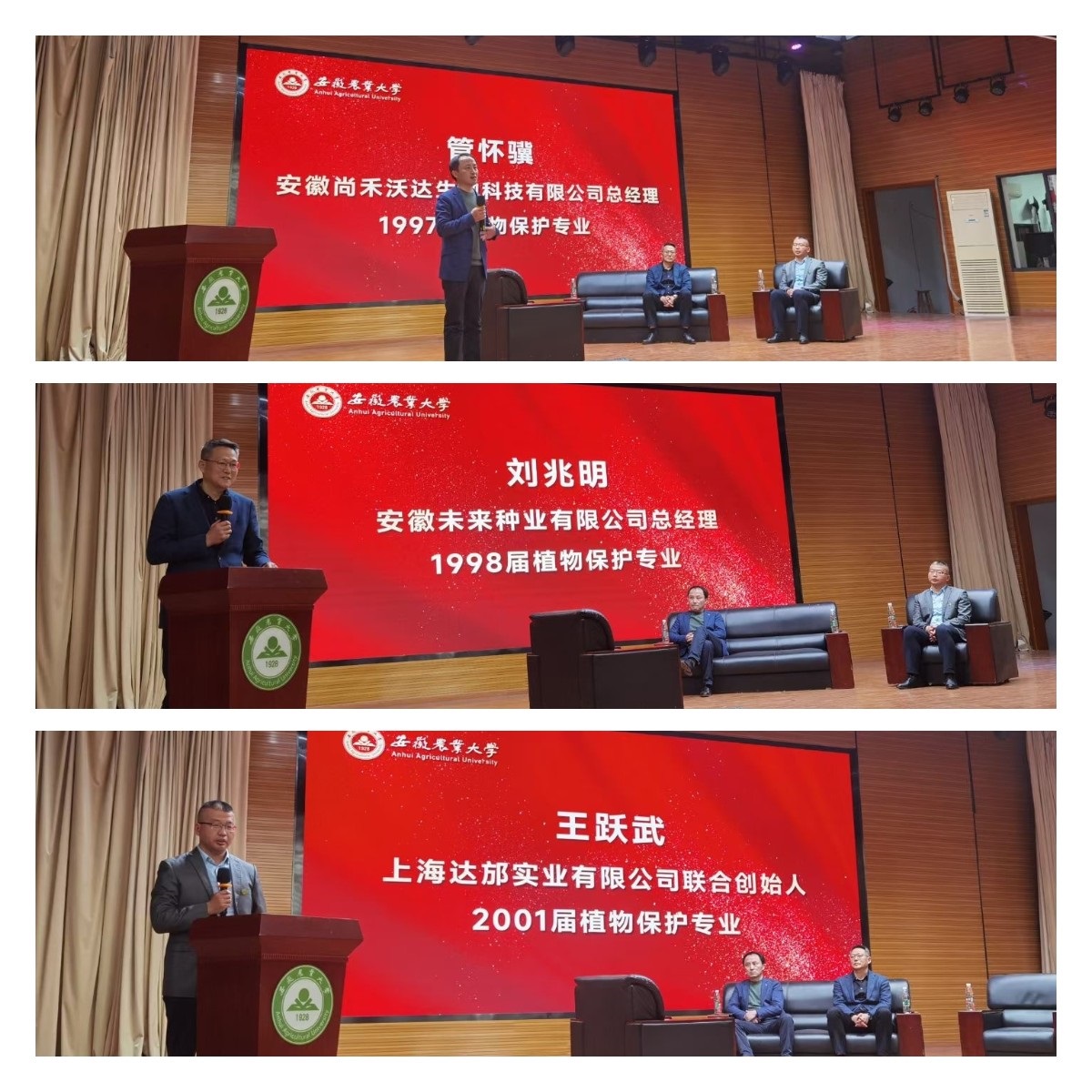 本网讯 3月28日下午,植物保护学院举办“植根未来”校友返校活动。1997届植物保护专业校友、安徽尚禾沃达生物科技有限公司总经理管怀骥,1998届植物保护专业校友、安徽未来种业有限公司总经理刘兆明,2001届植物保护专业校友、上海达邡实业有限公司联合创始人王跃武,应邀在欣苑大学生活动中心作辅导报告。学院党委书记刘柳、常务副院长潘月敏、党委副书记汪小强,2023届毕业研究生和本科生代表以及非毕业班本科生和研究生代表共计300余人参加了报告会。
