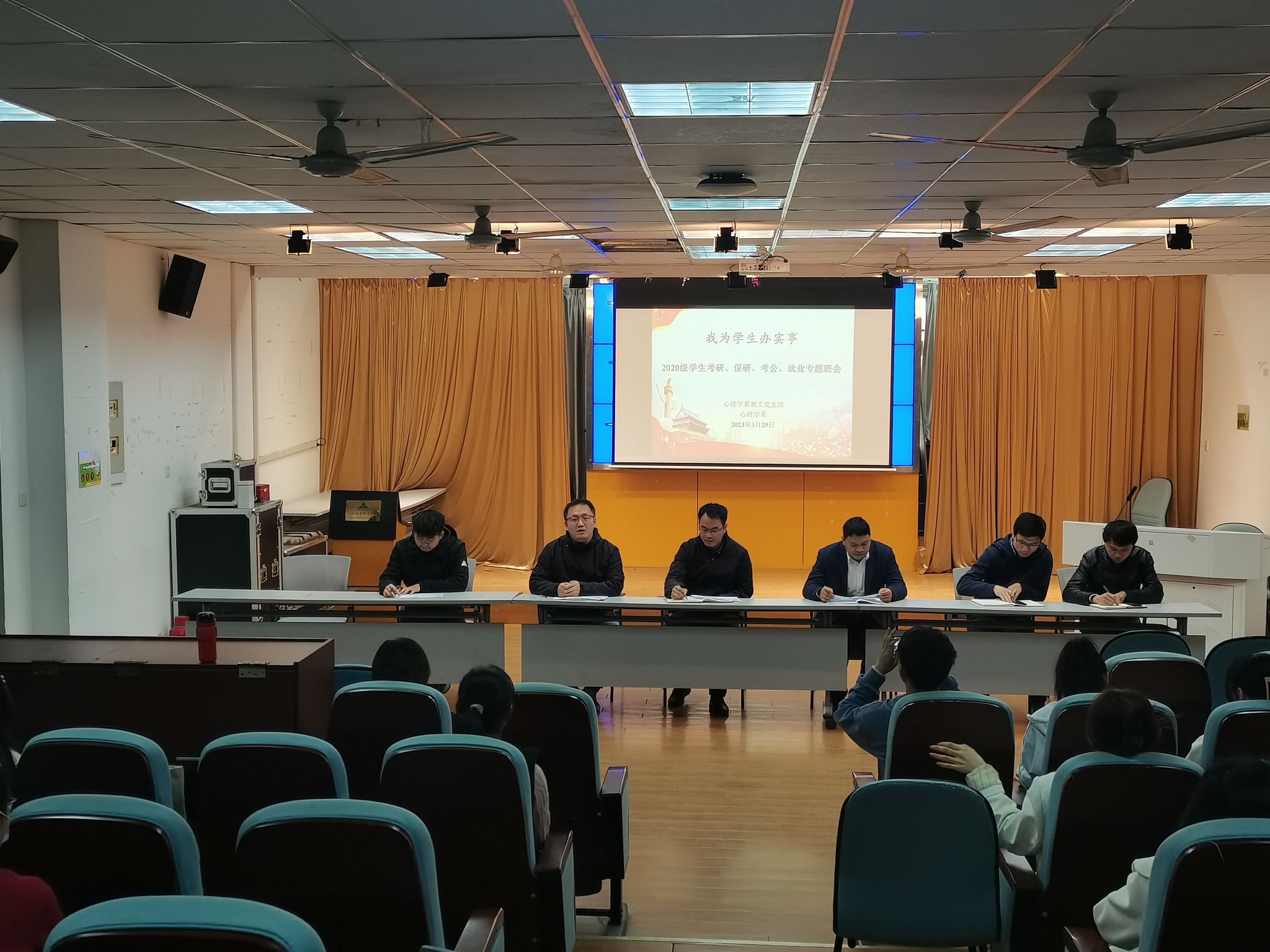 心理学系主任刘燊、党支部书记苑明亮和胡鹏老师结合自身成长经历分别回应了同学们的困惑和疑问。表示心理学系全体教职工会切实做好考研前精准辅导,及时拓宽就业实习渠道,也会扎实推进考研复试“一对一”辅导。