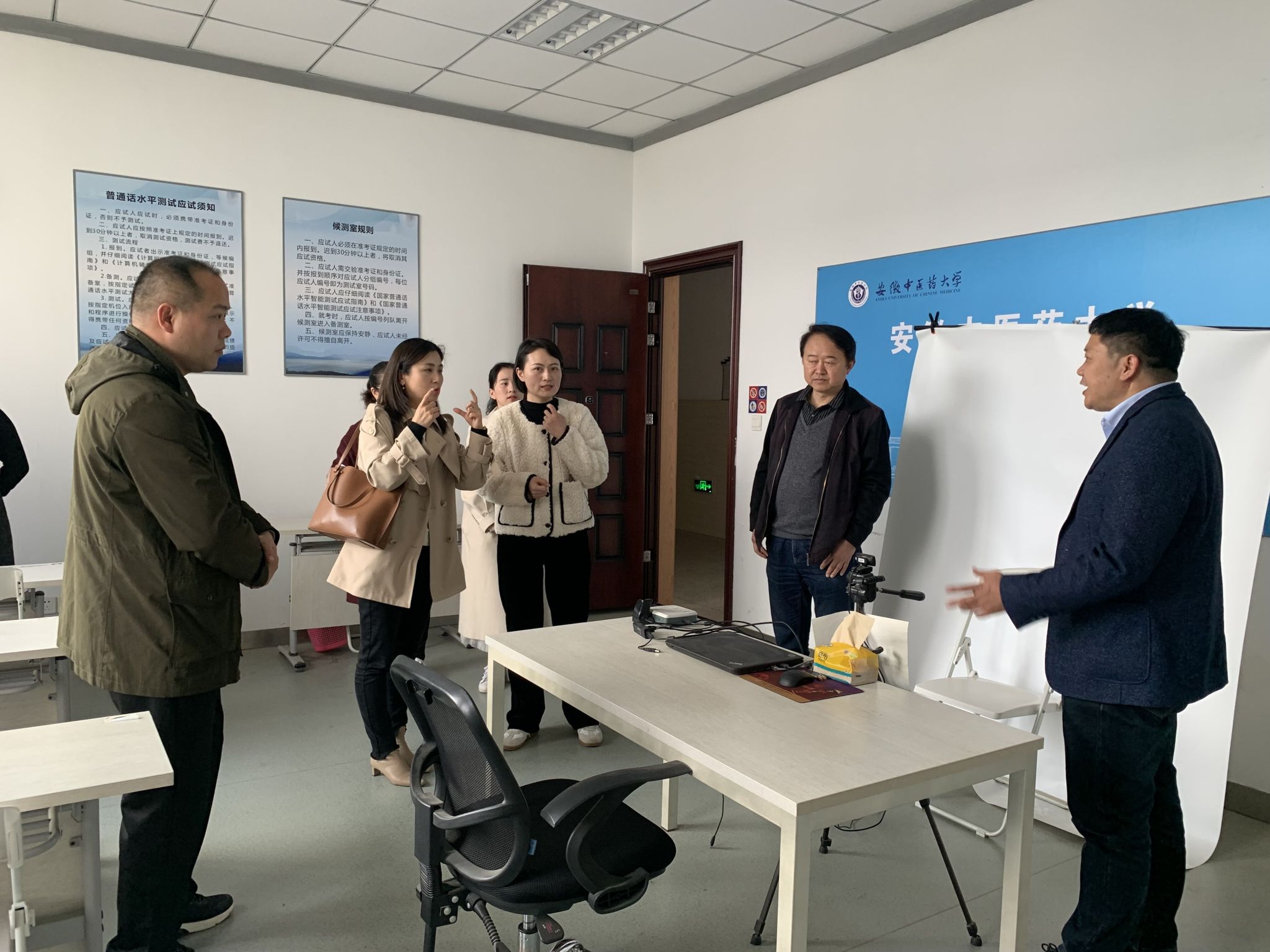 会上,双方就普通话测试信息采集、考生备测、机测考试、测试员培训等环节进行了深入交流,双方均表示要加强交流互动,在学生培养、教师互访、学科建设、专业建设等方面开展多元合作。黄洪雷一行还实地参观考察了安徽中医院大学普通话测试站各功能区建设和运行情况,为我校普通话测试站做好下一阶段工作提供了良好的借鉴和启发。(作者:王静 一审:单国雷 二审:黄洪雷 三审:吴渭)