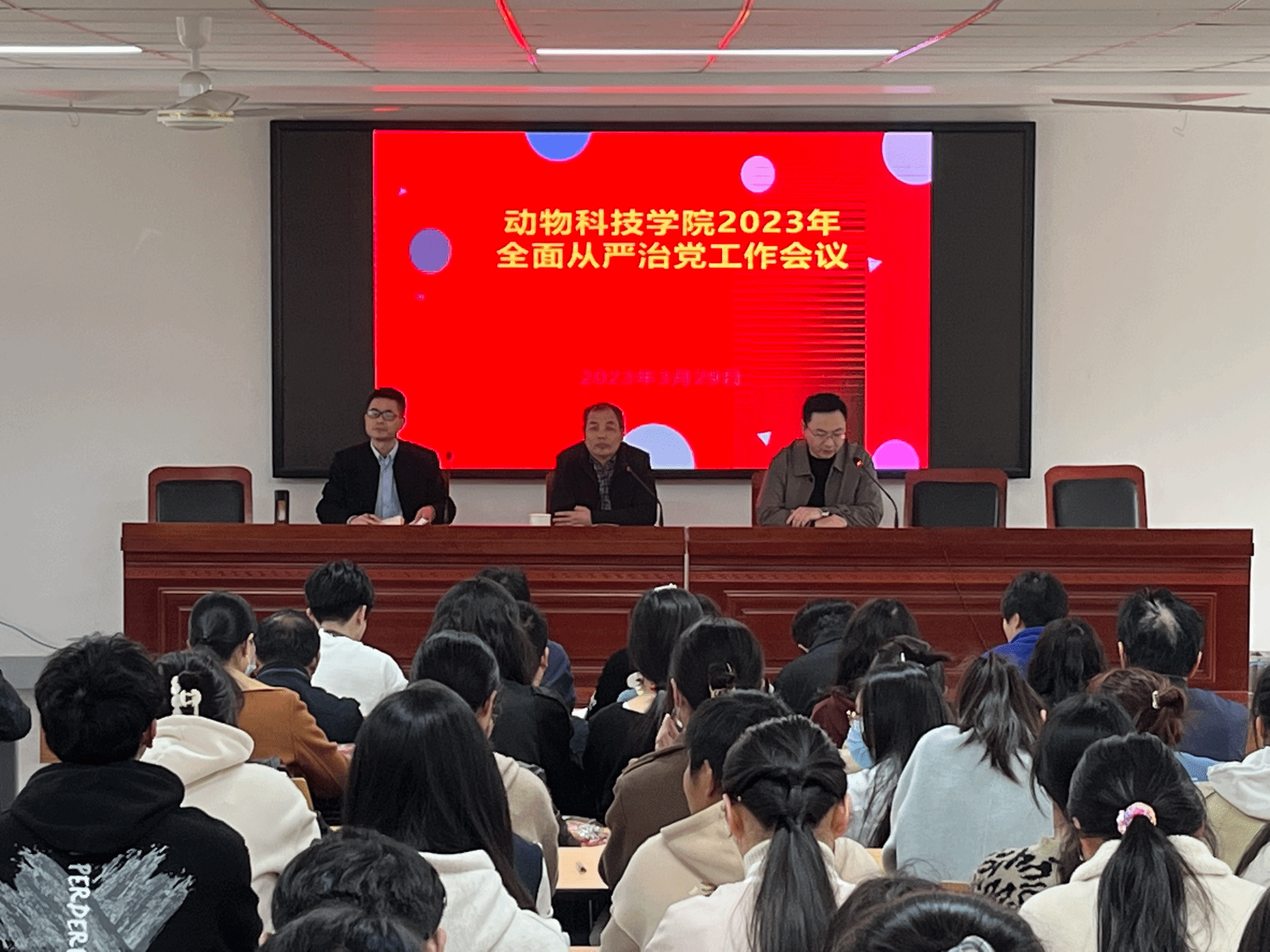 本网讯 3月29日,动物科技学院召开2023年全面从严治党会议,传达学习学校2023年全面从严治党工作会议精神,部署2023年重点任务。学院党委书记曹俊作动员,学院党委副书记、纪委书记、副院长章巍开展案例教育。会议由学院党委委员、副院长涂健主持,学院领导班子成员、全体师生党员参加了大会。