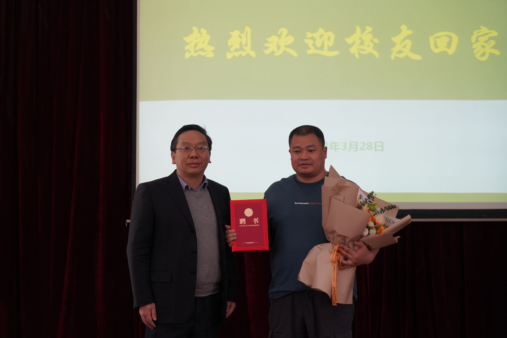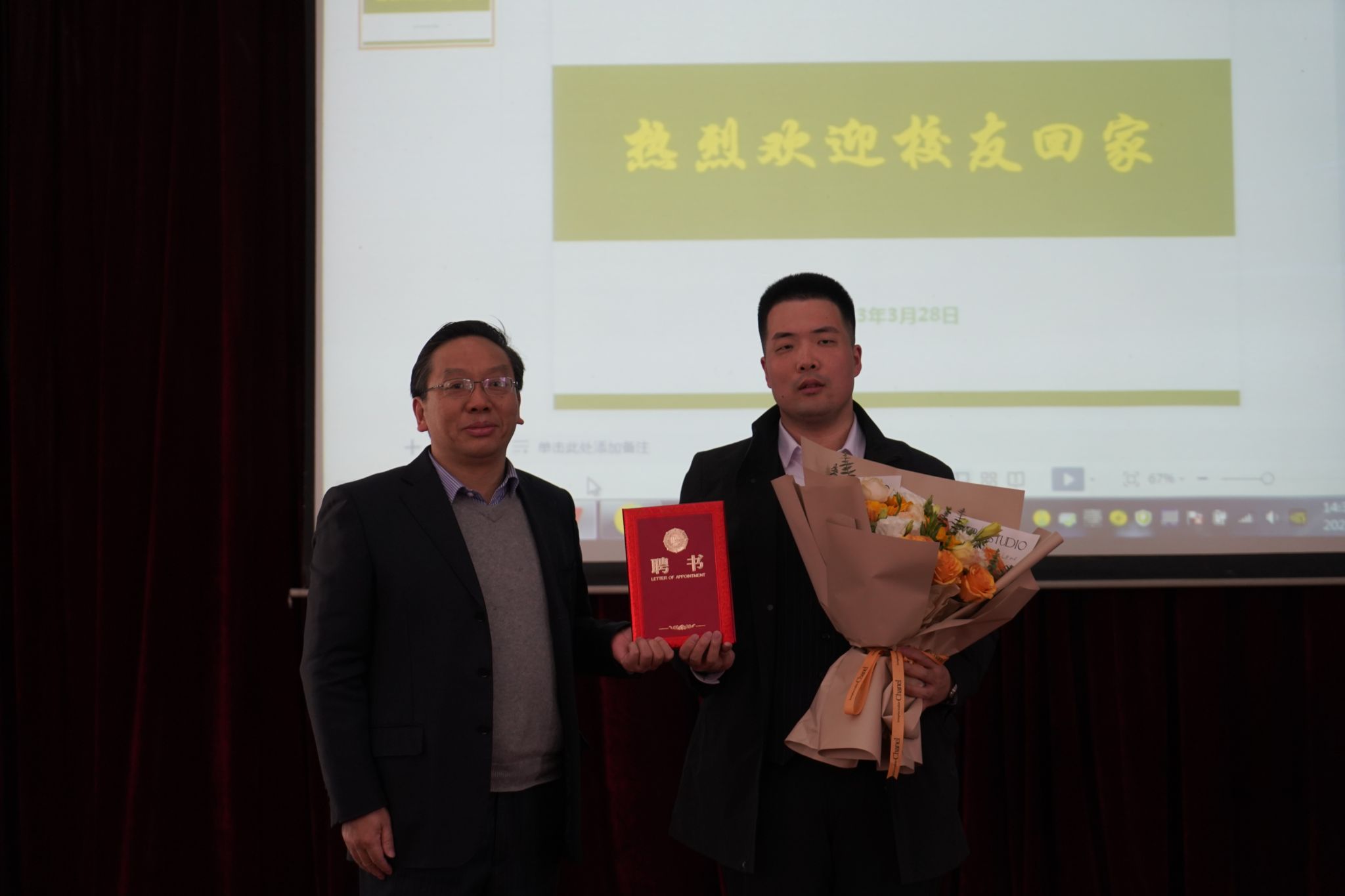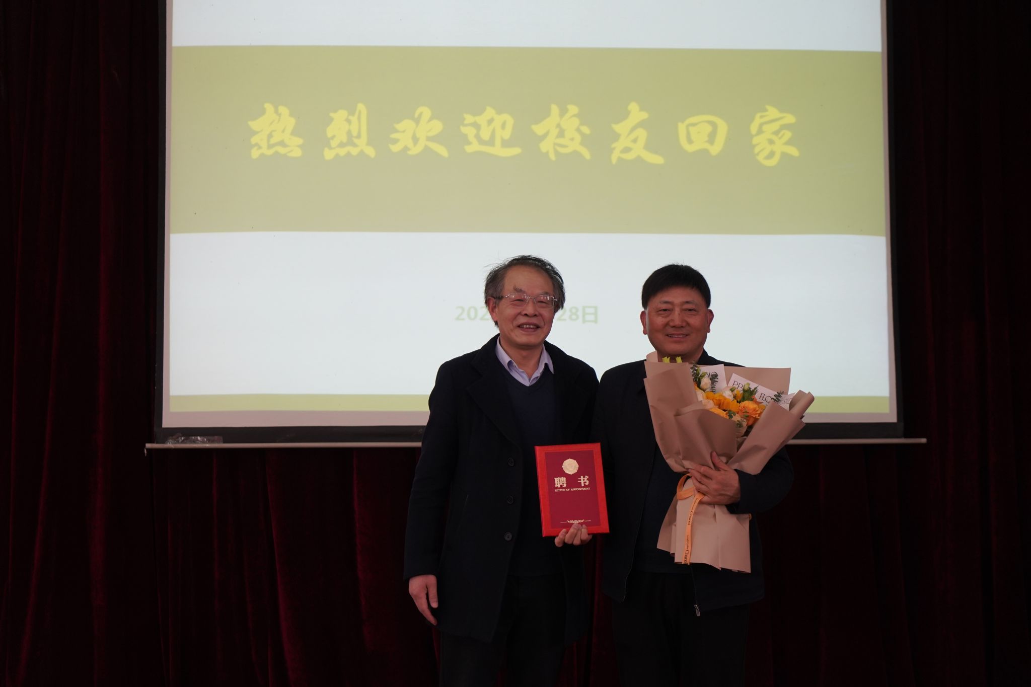 2点30分,优秀企业家校友聘任仪式举行。江正君、刘盛全分别为校友颁发聘书,聘请张海平、胡优华担任“为校外辅导员”,聘请袁涛担任“引航导师”,聘请柴永家担任“就业引航员”。