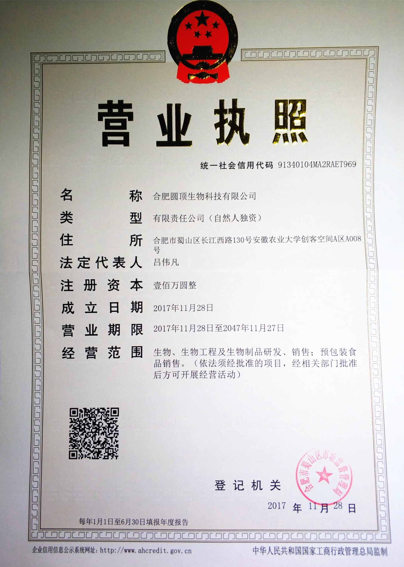 经历一系列的尝试后,团队积累了一定的资金并对发展方向有了新思路,在学院大力支持下该团队于今年11月底以2015级蚕学专业在校生吕伟凡同学为企业法定代表人,成功注册成立“合肥圆顶生物科技有限公司”。