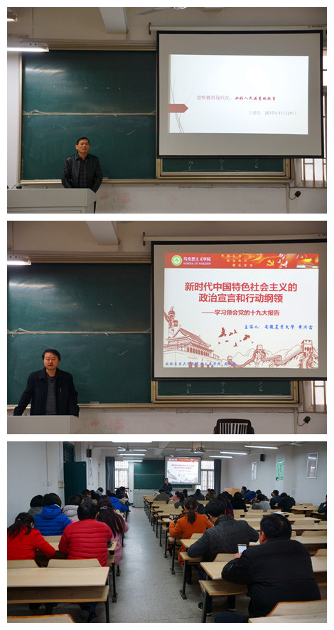 方章东围绕十九大会议对教育事业的聚焦及习近平总书记关于教育发展的系列论断、表述,详细阐述教育现代化的背景、意义、发展方略,并结合学院人才培养方案、专业设置与学科发展,介绍了学院教育现代化的整体状况和推进措施。他强调,教育现代化是满足人民对美好生活新期待的重要内容,作为教育工作者不仅应着力教育设施的现代化建设,更要实现教育者整体素质的现代化建设,要以积极进取的学习状态,使自我不仅具备爱学生的高尚情操,更具备爱学生的扎实本领。最后,他强调,要将学习贯彻党的十九大精神做实到共同干事创业之中,做实到深化教育教学改革新举措,拓展科学研究、社会服务新路径,培养适应新时代中国特色社会主义事业发展的全面人才之中。
