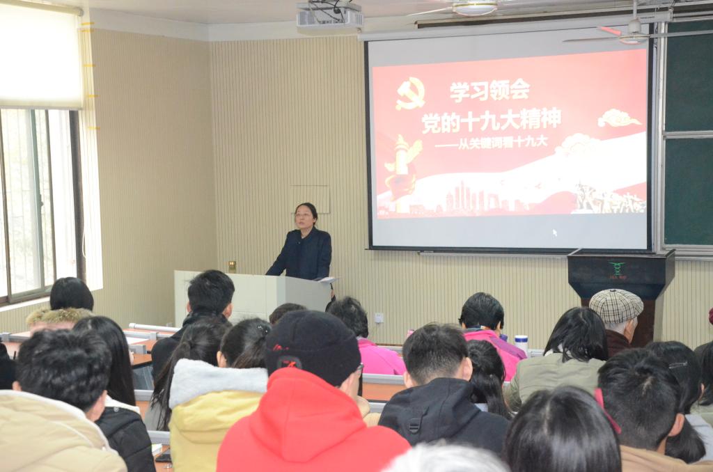 12月4日,学院党委书记崔云以“深入学习领会习近平新时代中国特色社会主义思想——学习领会党的十九大精神”为题,从十个关键词解读了十九大精神新的历史方位、新的理论创新成果、社会主要矛盾历史性新变化、新的奋斗目标和党的建设新要求五“新”特征。结合十九大报告中对高等教育的具体要求,她指出,习近平总书记在十九大工作报告中指出“要建设教育强国,优先发展教育,深化教育改革,加快教育现代化,办好人民满意教育,加快一流大学和一流学科建设,实现高等教育内涵式发展”,高校的发展迎来了新的机遇和挑战。在这样的背景之下,学院制定了“一流学科”建设方案,加快推进“十三五”各项任务的落实,全体师生要统一思想、凝聚共识,为“一流学科”建设和学校、学院事业发展贡献力量。
