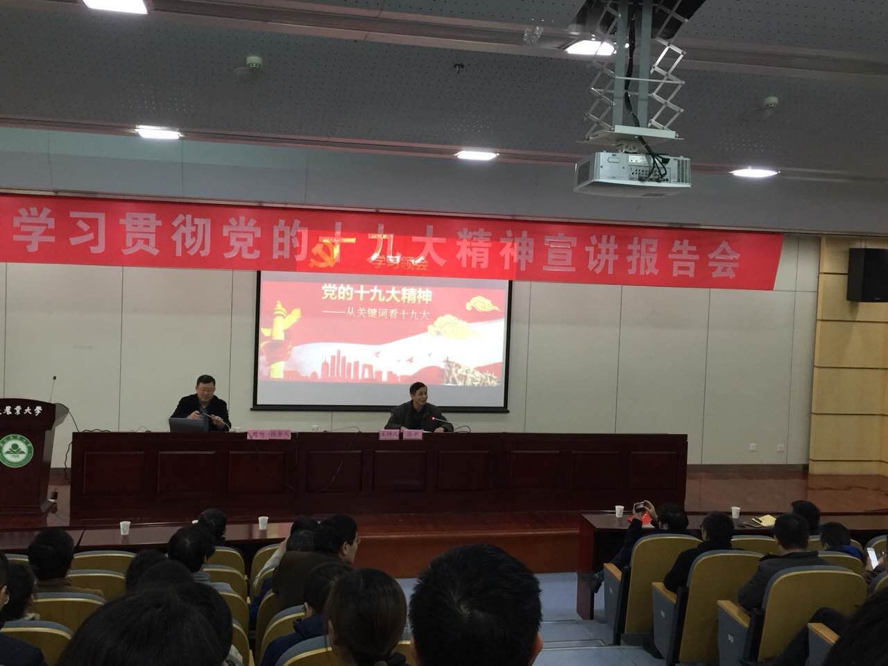 周旭以《学习领会党的十九大精神——从关键词看十九大》为题,紧紧围绕十九大主题、重要成果、过去五年取得的历史性成就和历史性变革、中国特色社会主义进入新时代、党的指导思想(新思想)、社会主要矛盾转化、新征程、经济社会发展新部署、党的建设等方面结合大量的事例做了详细的解读。他针对性的解读了国家乡村振兴战略,从国家的部署到安徽省委的举措,再到学校所做的工作,以及我们两个学院今后的努力方向等深入谈了自己的体会。