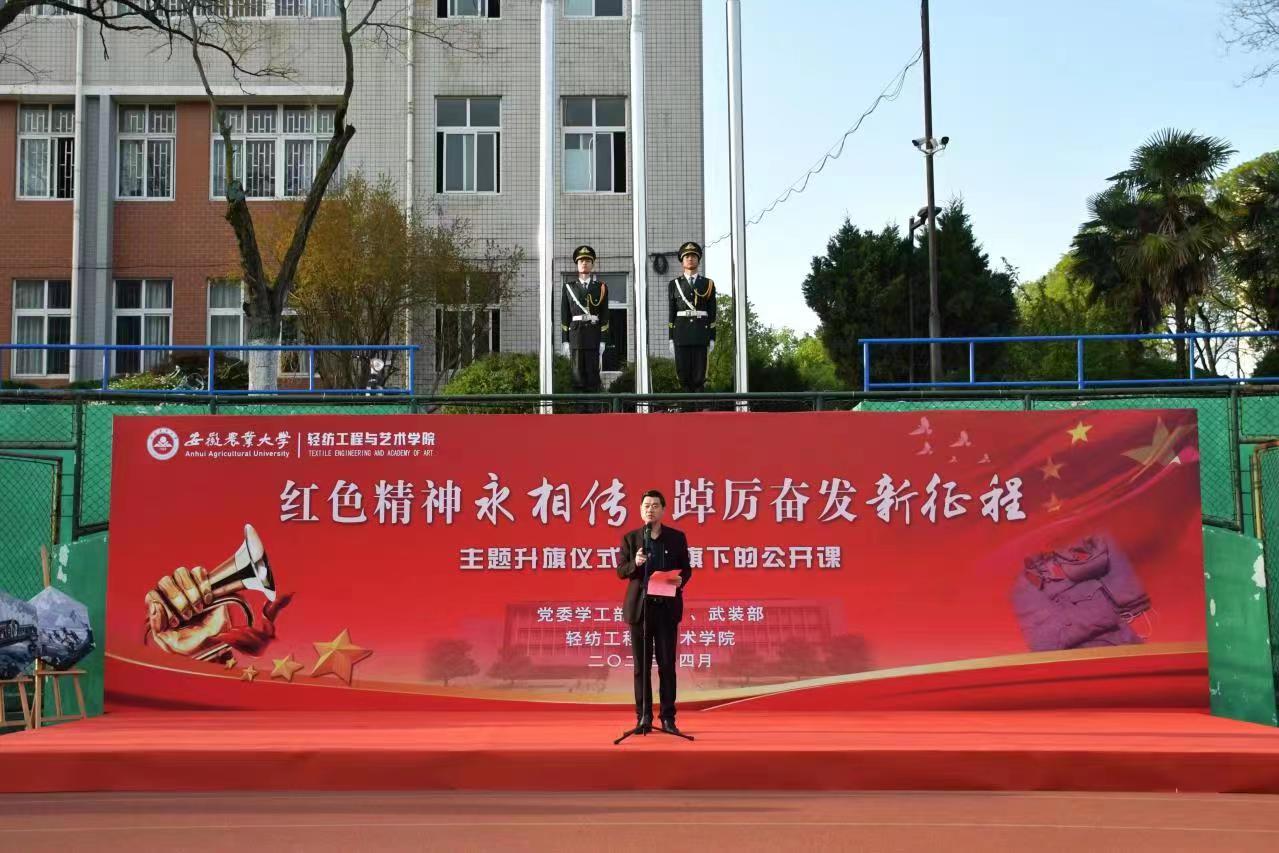 本网讯 为深入学习宣传贯彻党的二十大精神,贯彻落实习近平总书记关于传承红色基因重要论述,引导广大青年继承革命优良传统,在科技兴农、现代化美好安徽建设新征程中贡献安农力量。4月10日清晨,轻纺工程与艺术学院举行“红色精神永相传 踔厉奋发新征程”主题升旗仪式暨国旗下的公开课,出席升旗仪式有党委学工部(处)、武装部副处长周涛、学院党委书记夏成云、院长汪钟凯、副院长王健、副院长周晓娟和学院党委、支部书记、专职辅导员、本科生和研究生党员、22级本科生,升旗仪式由学院党委副书记宋超主持。