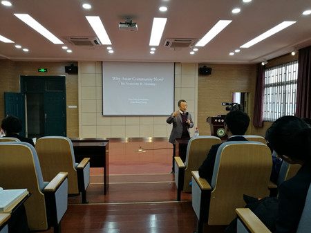 本网讯12月7日下午,在外国语学院502多媒体报告厅,日本同一亚洲财团首席研究员郑俊坤教授给大家带来了题为《亚洲命运共同体的必要性及其意义》的精彩讲座。这次讲座是外国语学院日语系主办的“亚洲命运共同体”大型学术讲座的第十一讲。讲座由日语系主任王磊主持,日语系师生以及安徽新华学院的部分老师参加了讲座。
