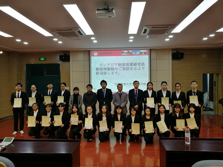 讲座结束之际,还举行了奖学金颁奖仪式。日本同一亚洲财团对我校外国学院日语系20名学生给予奖励,用于表彰他们在此次系列讲座中的突出表现。郑俊坤和外国语学院日语系主任王磊为获奖学生颁奖。