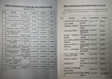 学院严格按照《中国共产党发展党员工作细则》和学校学生党支部标准化建设要求,制定了《资源与环境学院学生党员发展对象24个学时专题培训安排表》,培训以集中学习、网上党校自学和主题实践相结合形式开展,集中培训以学生党支部书记和学生党员讲师团成员为主,重点开展入党程序和手续,学习党章和十九大精神、坚定青春信仰等;网上党校学习以中央纪律检查委员会副书记、监察部部长杨晓渡,国家监察部副部长屈万祥,中央党校知名教授张晓燕、张荣臣、陈述和国防科技大学教授金一南等网络党课视频为主,培训内容涉及党的十九大精神、党章党史党规等。
