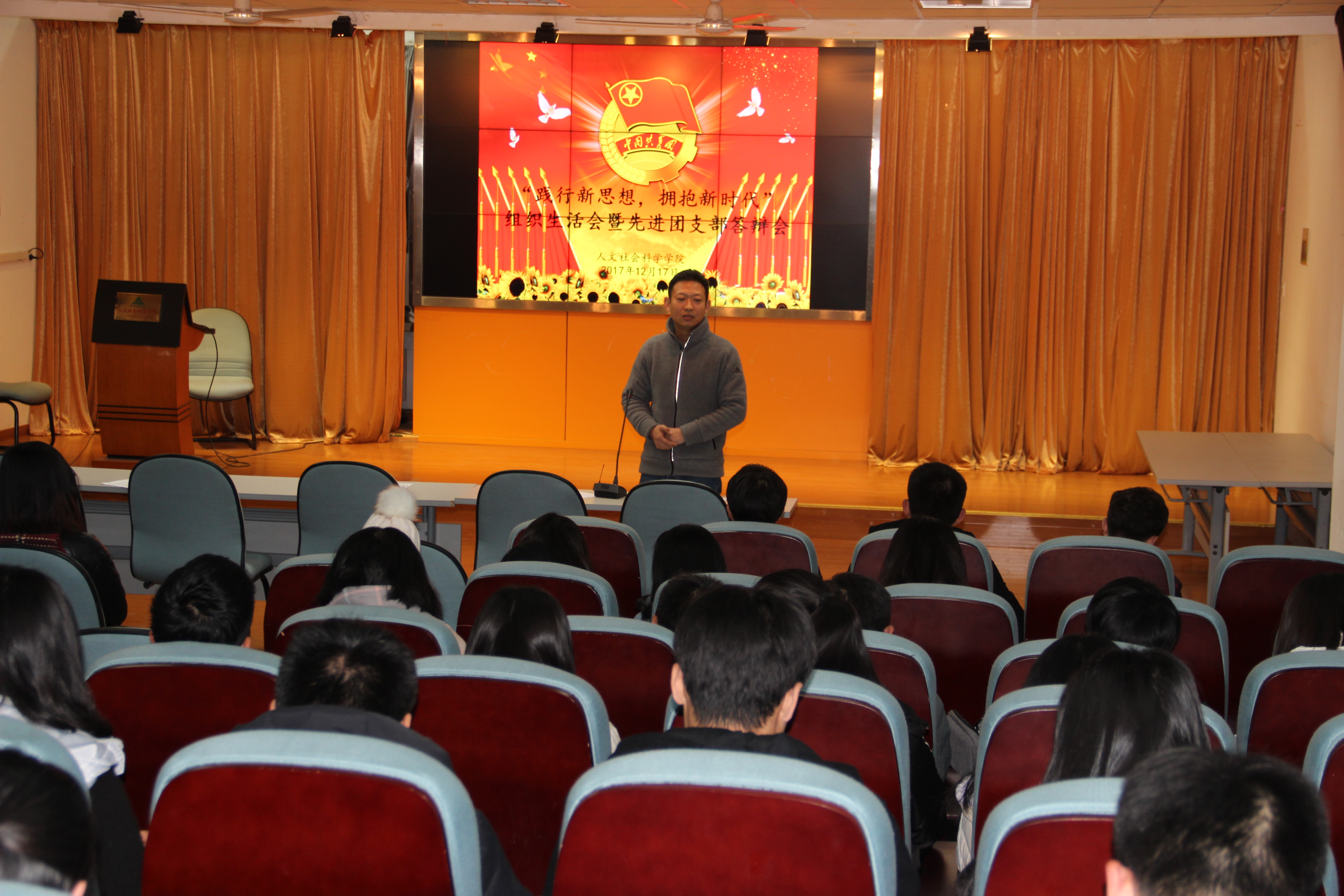 本网讯 为加强团干部思想建设,增强团组织凝聚力和战斗力,发挥广大团员青年模范作用。12月17日晚,人文社会科学学院在人文楼602教室开展以“践行新思想,拥抱新时代”为主题的2017年度团员组织生活会和先进团支部答辩会活动,院党委副书记吕大鹏、学生会主要学生干部及2015-2017级各班级主要团干代表参加了此次活动,活动由团委老师主持。