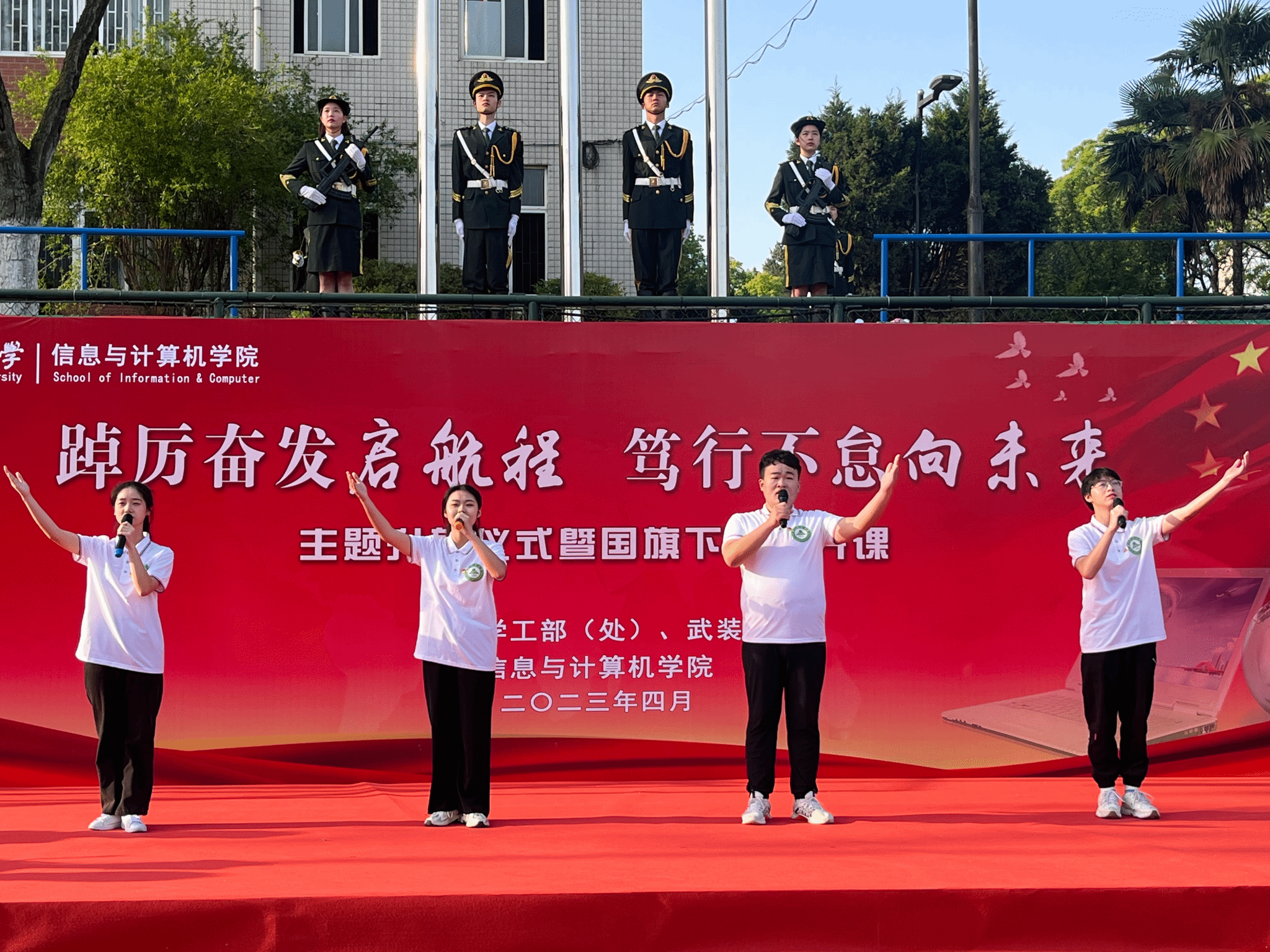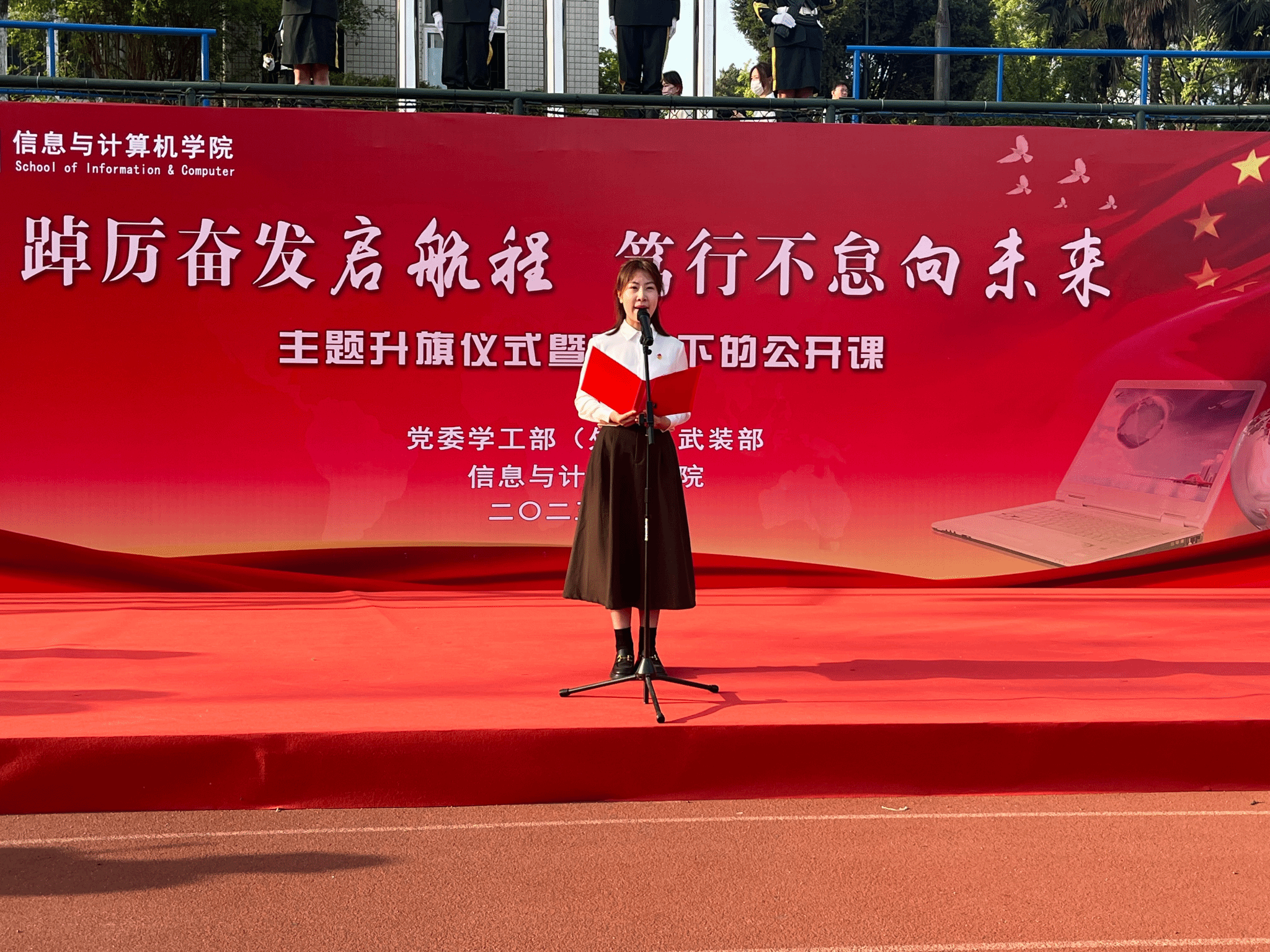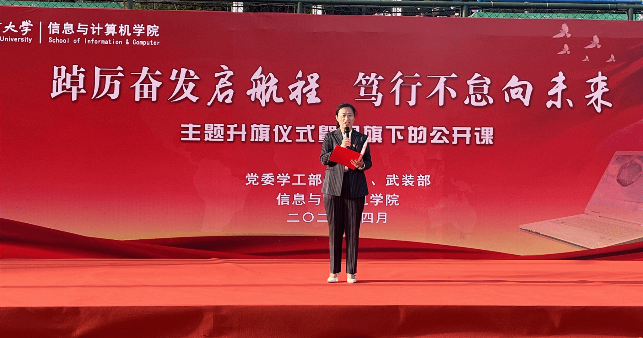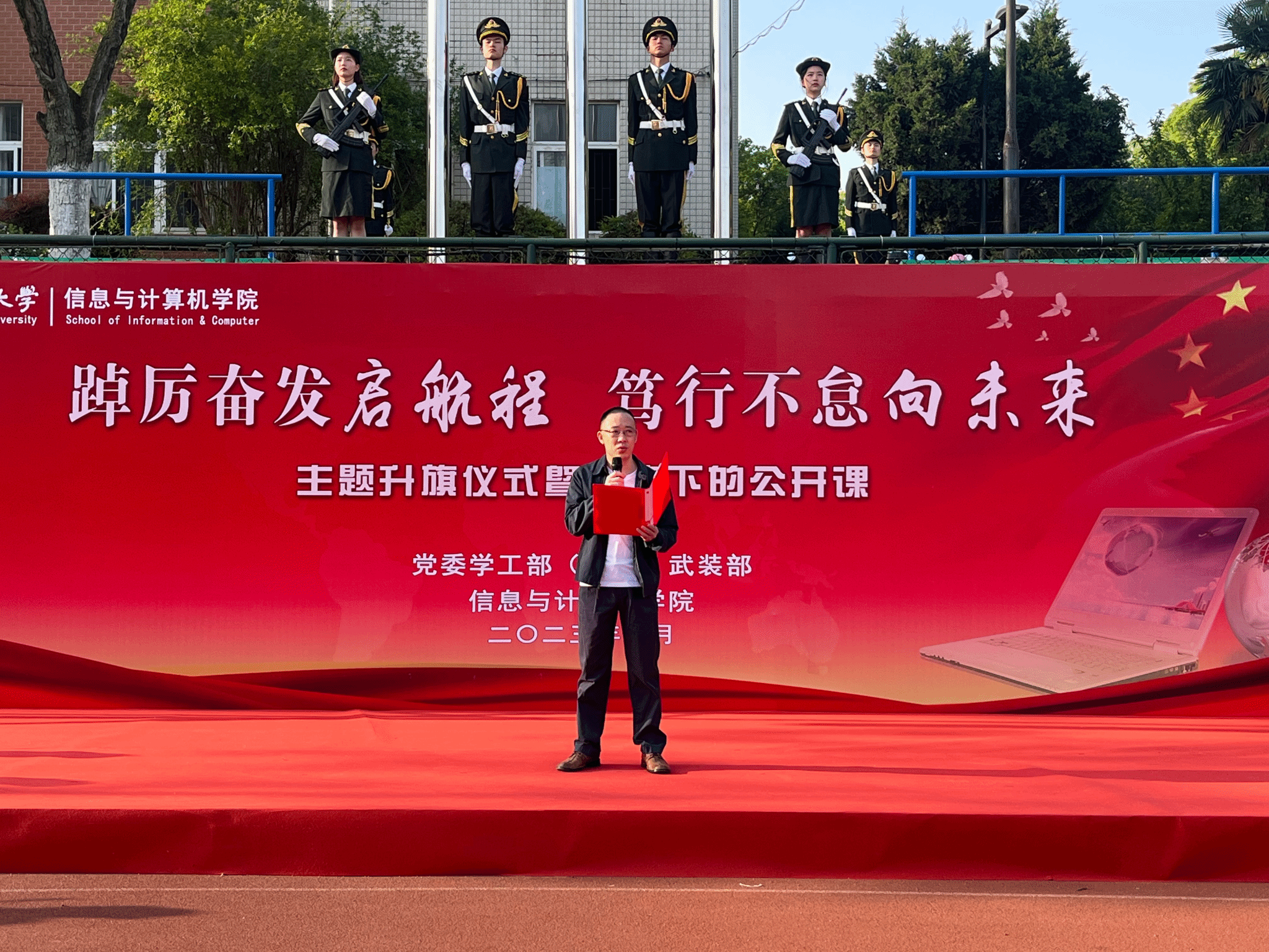 本网讯 为深入学习贯彻全国两会精神,扎实开展学习贯彻习近平新时代中国特色社会主义思想主题教育,4月17日清晨,信息与计算机学院在校第一运动场举行“踔厉奋发启航程,笃行不怠向未来”主题升旗仪式暨国旗下的公开课。校学工部(处)、武装部部长姚莉,学院党政领导、全体专兼职辅导员、党员发展对象、入党积极分子和学生代表参加了升旗仪式,升旗仪式由学院党委副书记、纪委书记李南飞主持。