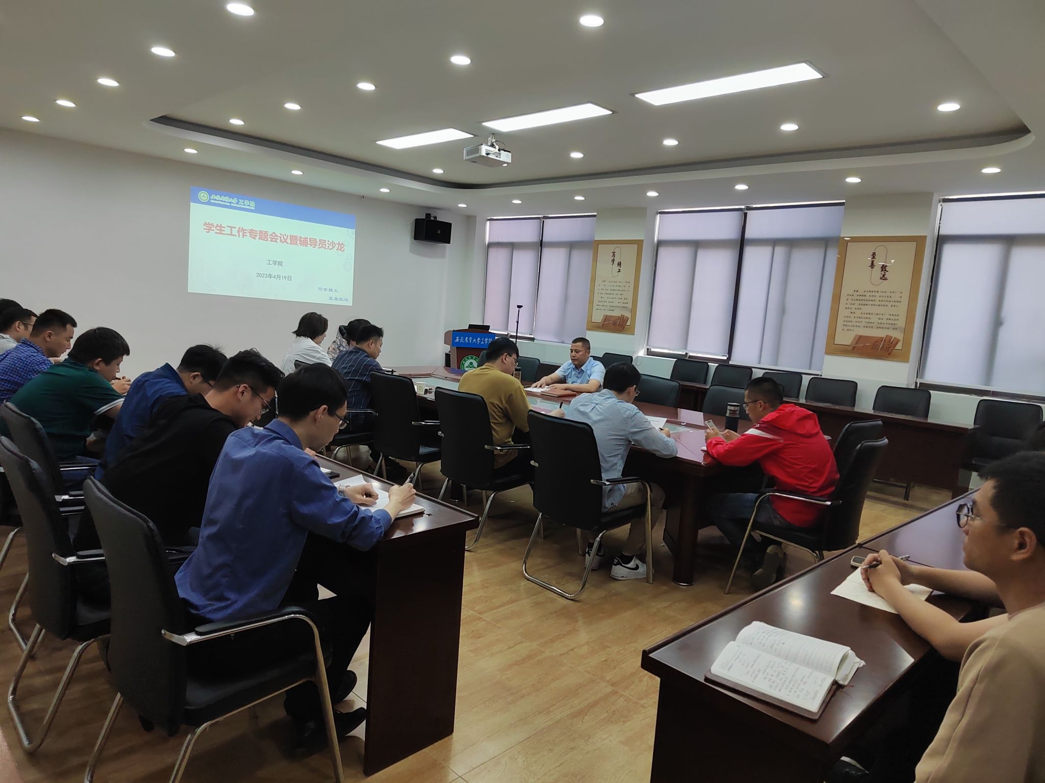 本网讯 4月19日下午,工学院召开学生工作专题会议暨辅导员沙龙,全体专兼职辅导员参加会议。院党委副书记、纪委书记、副院长张国学主持会议。