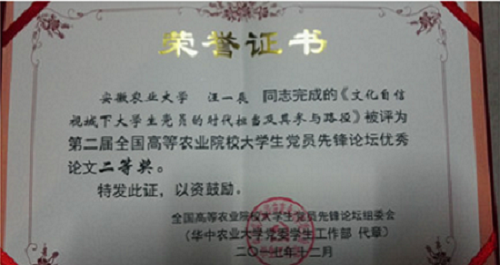 汪一辰提交的参会论文《文化视域自信下大学生党员的时代当代及其参与路径》获评全国高等农业院校大学生党员先锋论坛优秀论文二等奖,指导老师方黎。在小组分论坛中,汪一辰与其他农业院校的参会同学进行了坦诚而深入的交流,他不仅向小组同学介绍了学校和学院的学习环境,还向与会同学交流了学院学子学习党的十九大精神的热潮,并就自己论文中的观点,谈了大学生党员如何结合自身实际情况参与文化自信的建构。