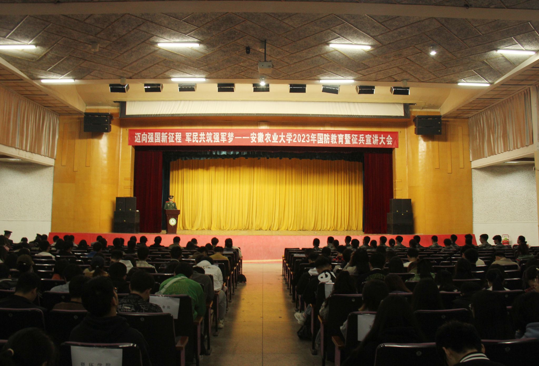 本次宣讲会邀请武警安徽总队机动支队服役大学生士兵杨森、江勇以及被中国人民大学录取为硕士研究生的我校人文社会科学学院退伍学生窦智远、茶与食品科技学院2023年春季退伍学生王咸青四位同学做征兵宣讲。