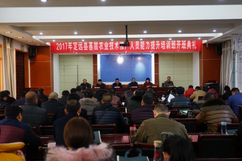 本网讯 12月26日下午,由定远县农业技术推广中心主办,继续教育学院和外国语学院共同承办的“定远县2017年基层农业技术推广人员能力提升培训班”顺利开班。继续教育学院院长何如海,外国语学院副院长孙志农、党委副书记黄庆华,定远县农业委员会沐永久,定远县农业技术推广中心副主任唐中兴出席开班仪式。开班式由外国语学院党委书记姚莉主持。