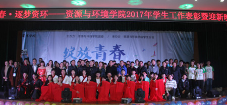 本网讯 12月27日晚,资源与环境学院“绽放青春·筑梦资环”工作表彰暨迎新晚会在欣苑四楼大学生活动中心举行,校学工部(处)处长彭庆刚、招生就业处处长刘海涛、团委书记张健、教务处赵学球老师,学院党政领导到场指导并为获奖师生颁奖。学院专兼职辅导员、教师代表与近500名学生参加了活动。