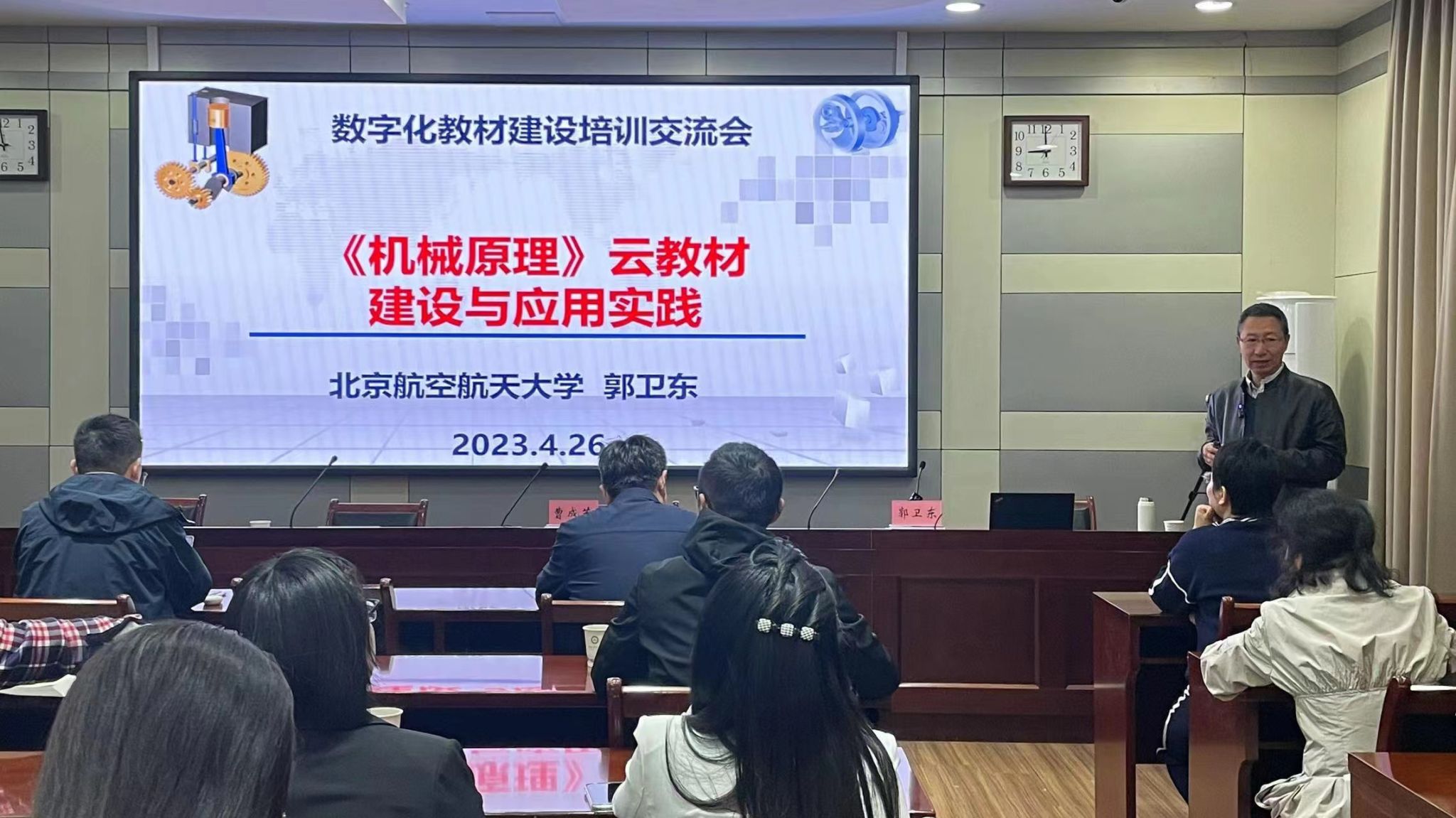 本网讯 为更好为教师提供一体化智能数字教材制作服务,切实提高教师数字教材的编辑、制作能力,4月26日上午,教务处举办数字化教材建设培训,为我校50多名教师进行专题培训。培训会上,北京航空航天大学郭卫东教授从编写初衷,教材简介,教材使用,编写体会四项内容进行了详细地讲解和答疑。郭卫东教授的报告实事求是、图文并茂、妙趣横生,现场会场气氛热烈,讨论积极。