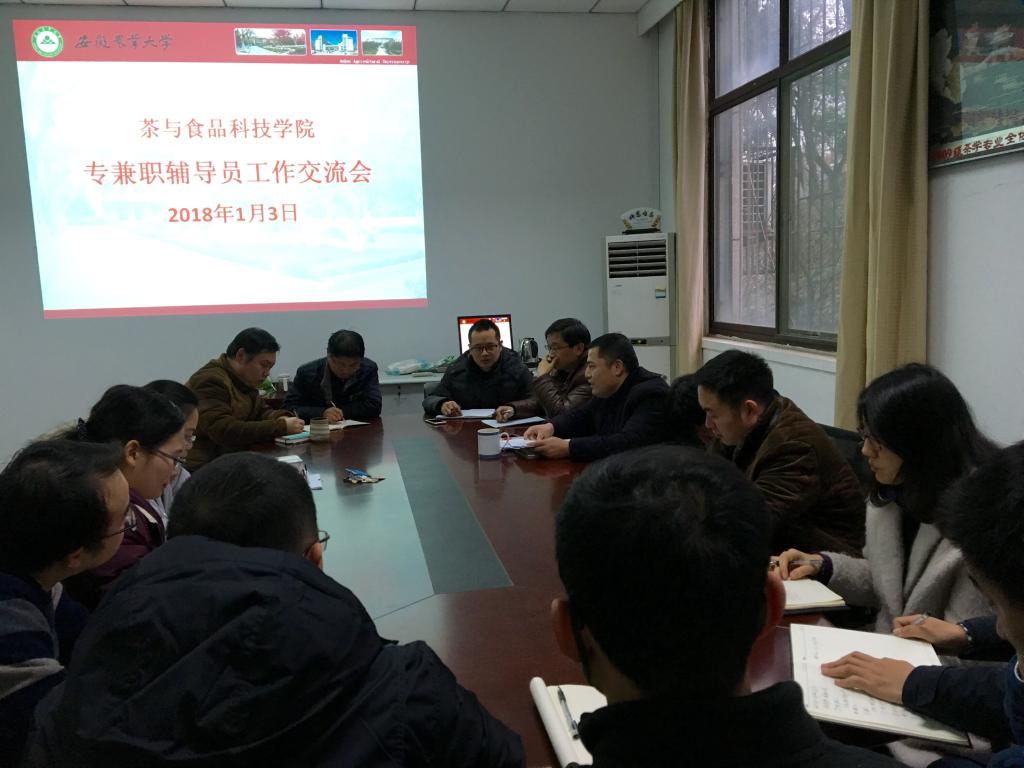 本网讯 1月3日下午,茶与食品科技学院在茶业楼106会议室召开专兼职辅导员工作会议,会议由院党委副书记、副院长张国学主持。