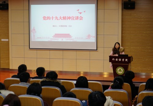 本网讯 1月3日晚,信息与计算机学院、外国语学院在外语楼502报告厅共同举办党的十九大精神学生报告团专场报告会,两个学院的团学工作负责人、各班级团支部和学生分会骨干近150余人参加了本次报告会。