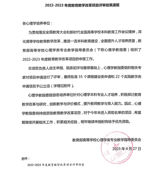 本网讯 近日,教育部高等学校心理学类专业教学指导委员会发布了2022-2023年度教育教学改革项目课题立项的通知,我院刘燊教授主持的课程建设类项目《实验心理学》获批立项。