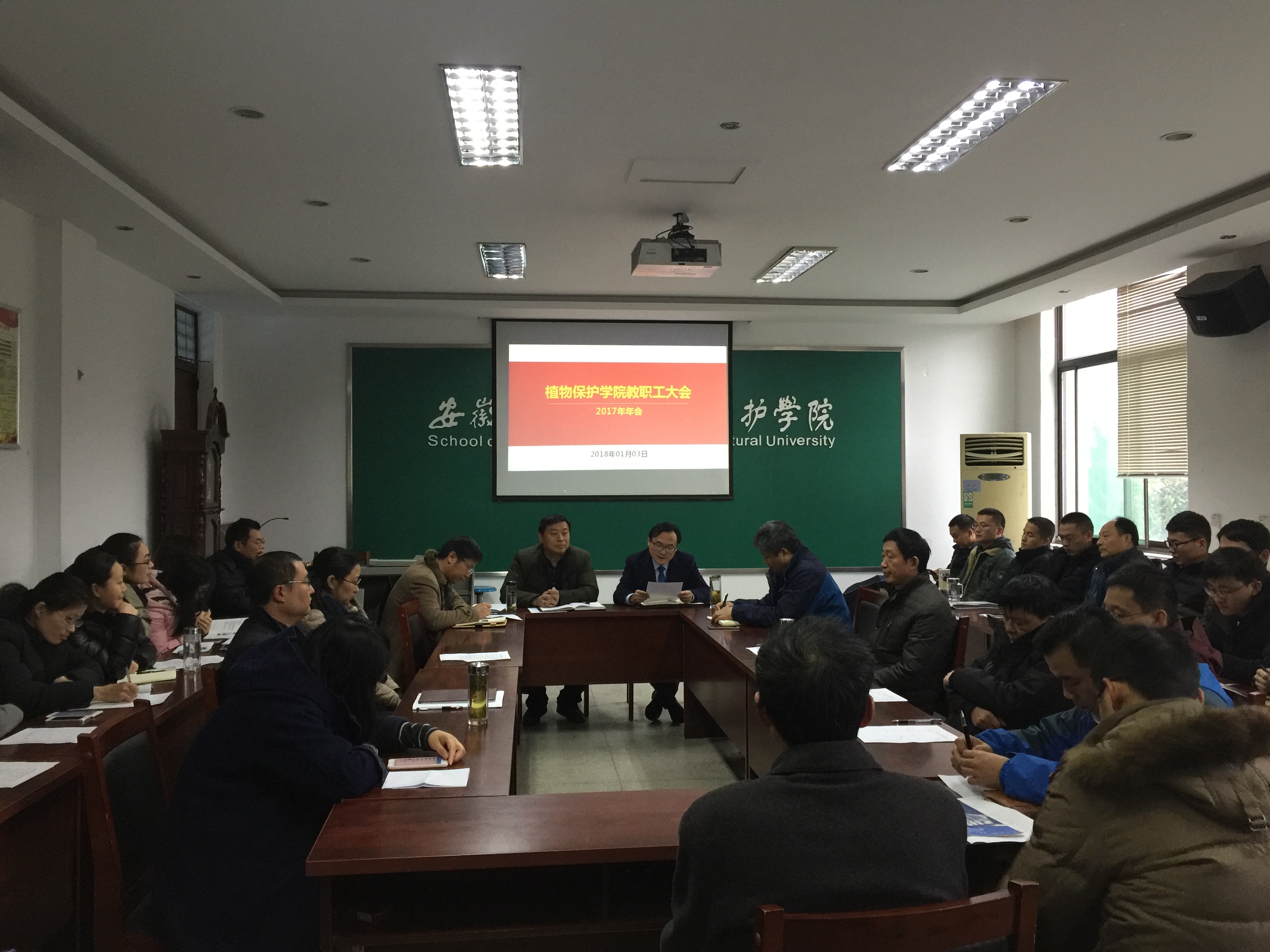 本网讯 1月3日,植物保护学院召开教职工大会2017年年会,会议由院党委书记檀根甲主持,院长操海群代表植保学院作了工作报告。学院党政负责同志及全体教职工参加会议。