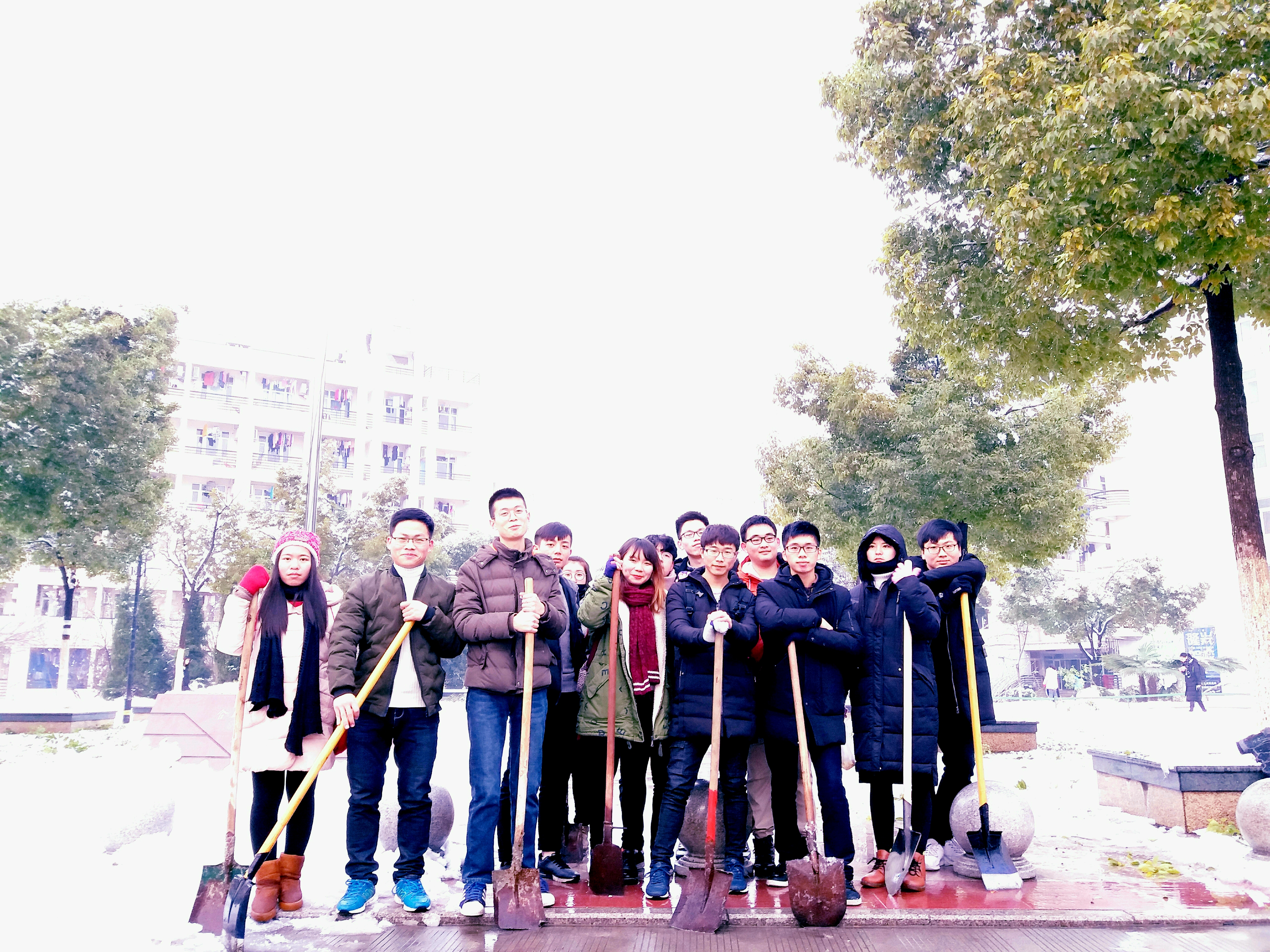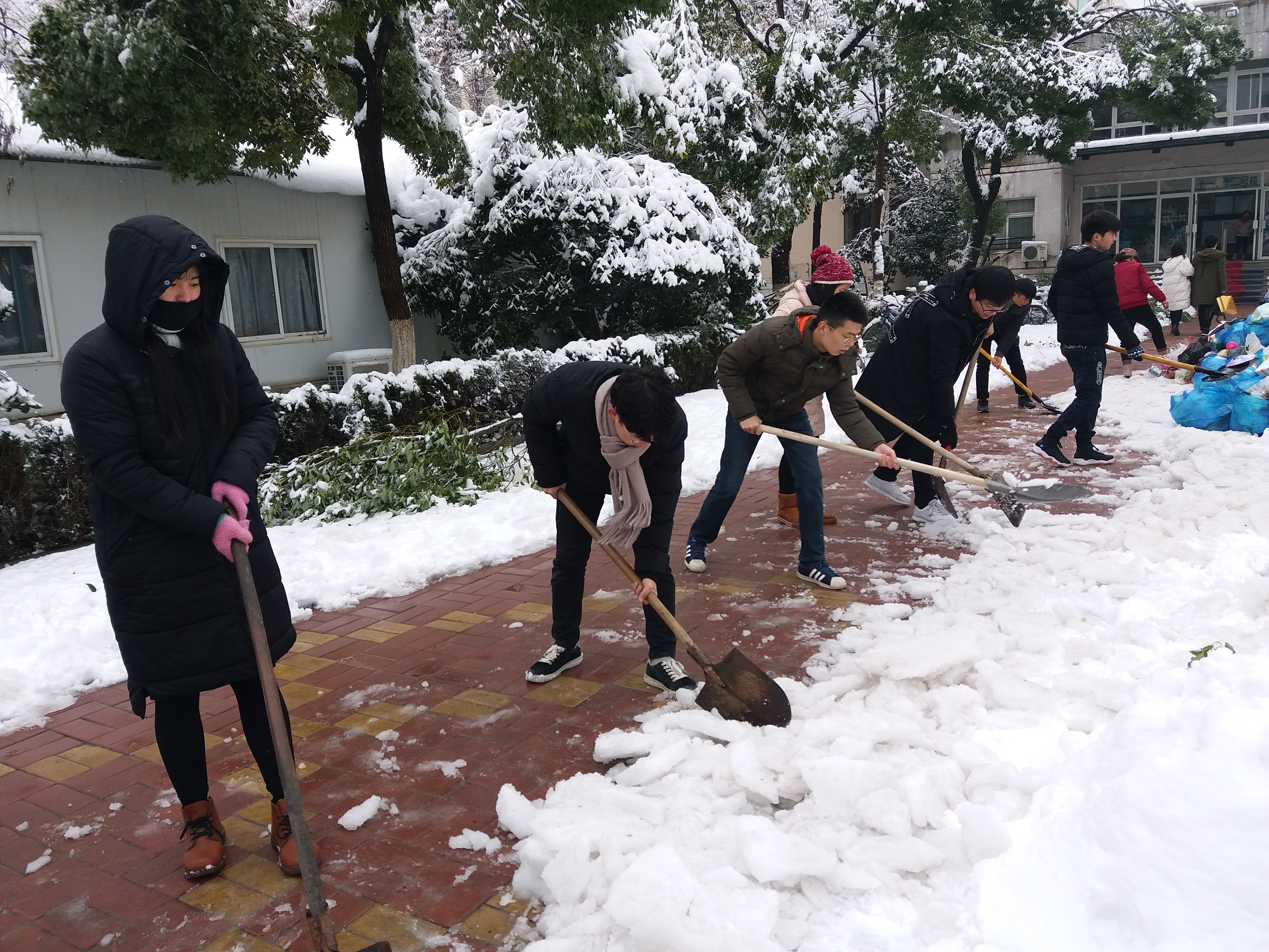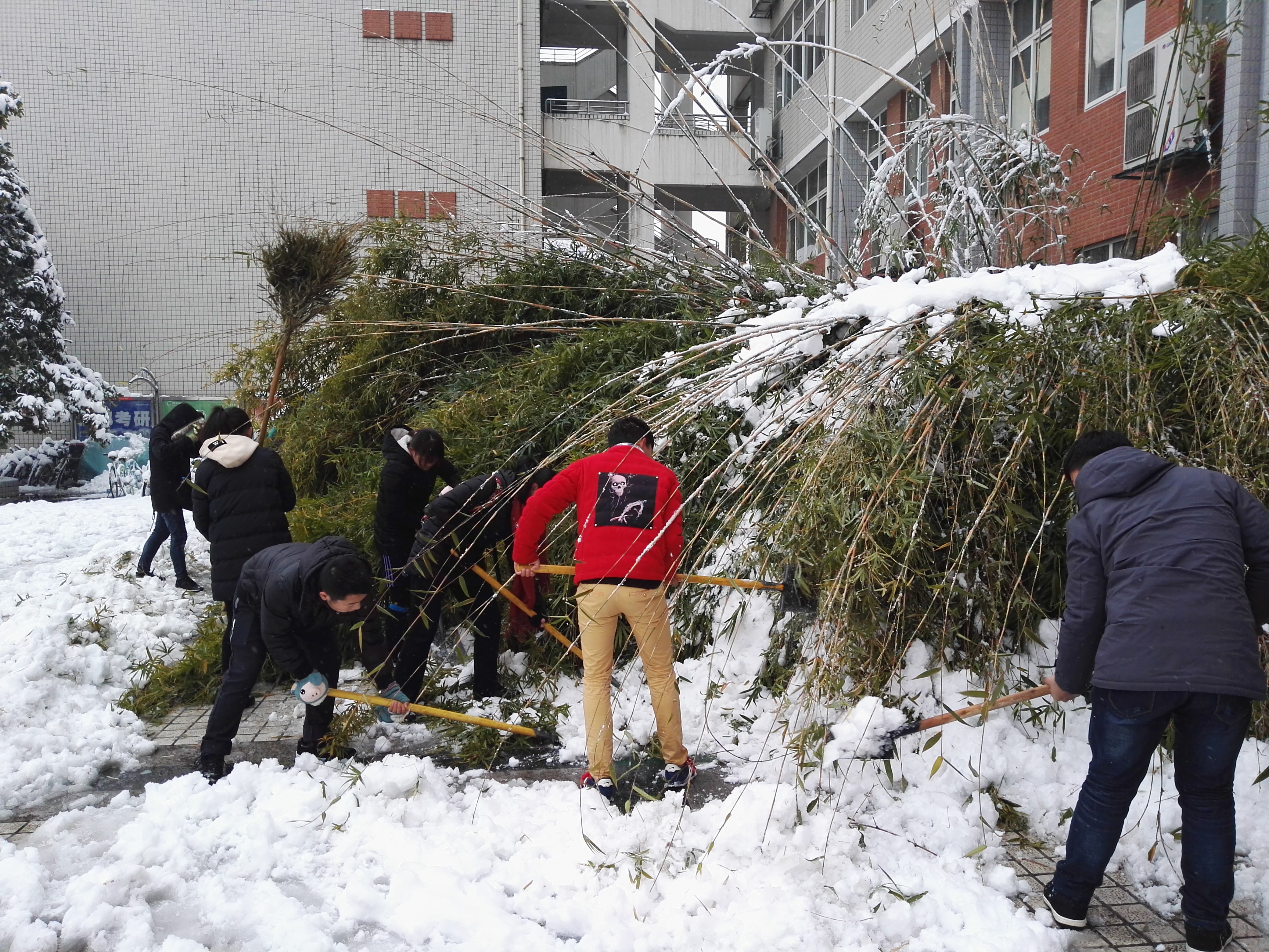 1月5日上午,2017级农学专业一批志愿者自觉加入拯救勤学楼门前被积雪压弯的竹子,大家有的用铁锹、竹竿,有的用扫帚、笤帚,对八教门前、竹子上的积雪进行了清扫,天很冷,但是同学们的志愿服务热情却未减半分,经过两个多小时的奋战,掩藏在暴雪下的竹子露出美丽的“真颜”,扫雪任务圆满完成。