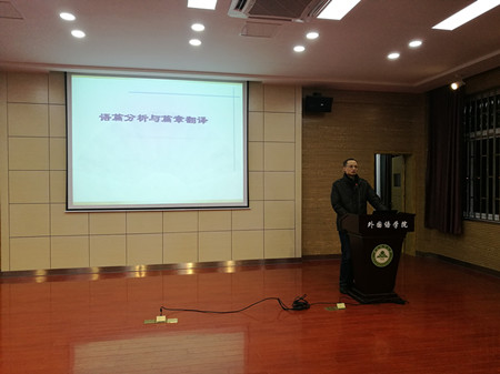 本网讯1月9日晚,外国语学院日语系主办的“亚洲命运共同体”大型系列学术讲座第十四讲于我校外国语学院502报告厅如期举行。外国语学院副院长孙志农副教授应邀为大家作了主题为“语篇分析与篇章翻译略论”的精彩讲座。讲座由日语系主任王磊主持,日语系以及英语系的学生参加了讲座。