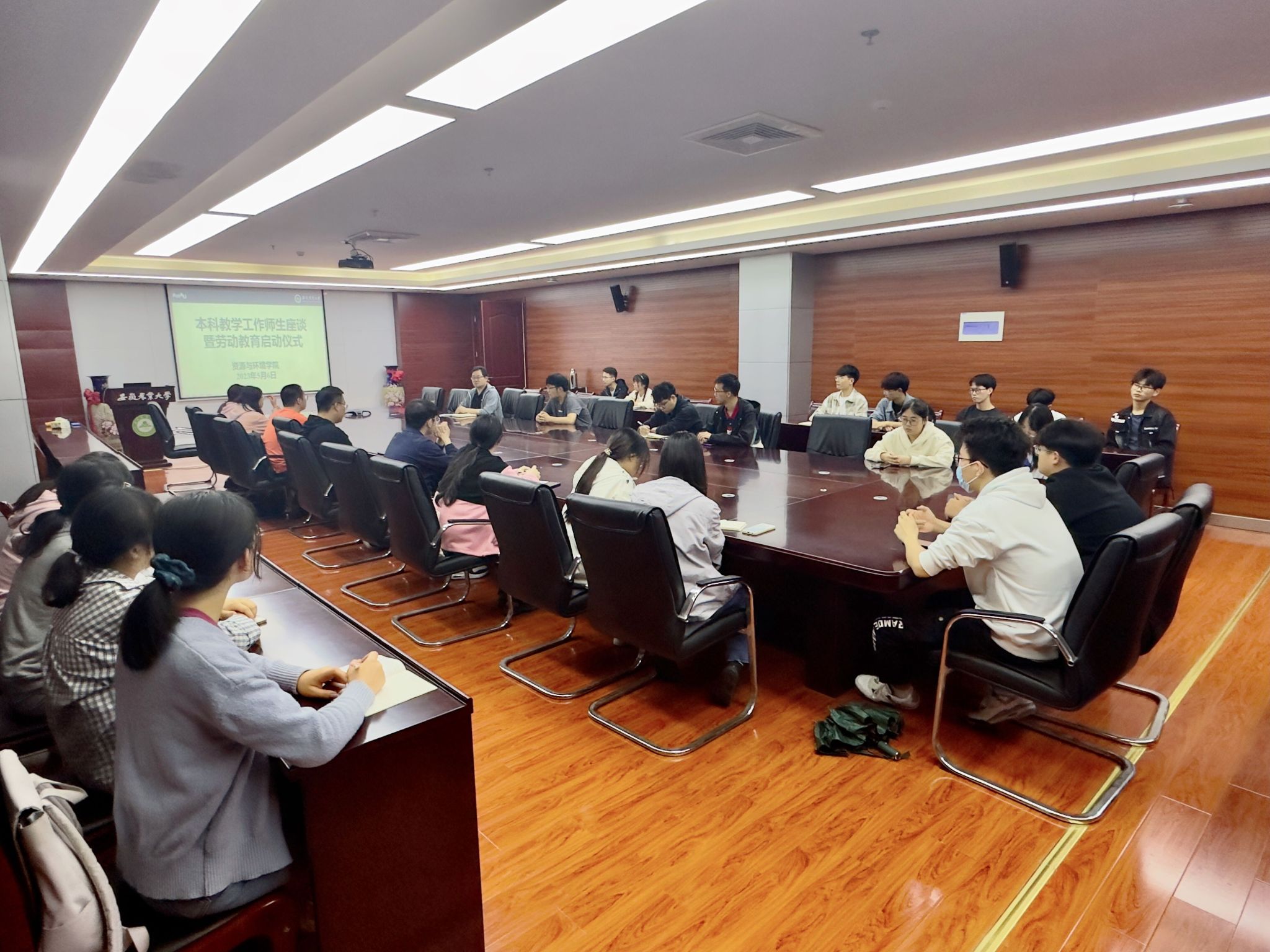 本网讯 为深化学习贯彻习近平新时代中国特色社会主义思想主题教育,扎实提高教学质量、加强教学建设,全面了解学生关于学院教学、学科竞赛和实习情况方面意见和建议,5月6日,资源与环境学院上在中西部综合楼南楼510会议室举行本科教学工作座谈会,举行“劳动铸就新征程”劳动教育启动仪式。学院各年级专业学生代表参加座谈,会议由副院长张震主持。