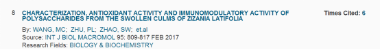 以汪名春博士为第一作者和通讯作者,发表在Int J Biol Macromol,2017,95:809-817上,题为Characterization, antioxidant activity and immunomodulatory activity of polysaccharides from the swollen culms ofZizania latifolia,入选生物学与生物化学领域高被引论文。