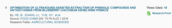 以硕士生贺博为第一作者,高学玲教授为通讯作者,发表在Food Chem,2016,204:70-76上,题为Optimization of Ultrasound-Assisted Extraction of phenolic compounds and anthocyanins from blueberry (Vaccinium ashei) wine pomace,入选农业科学领域,此文还同时入选为Research Front。